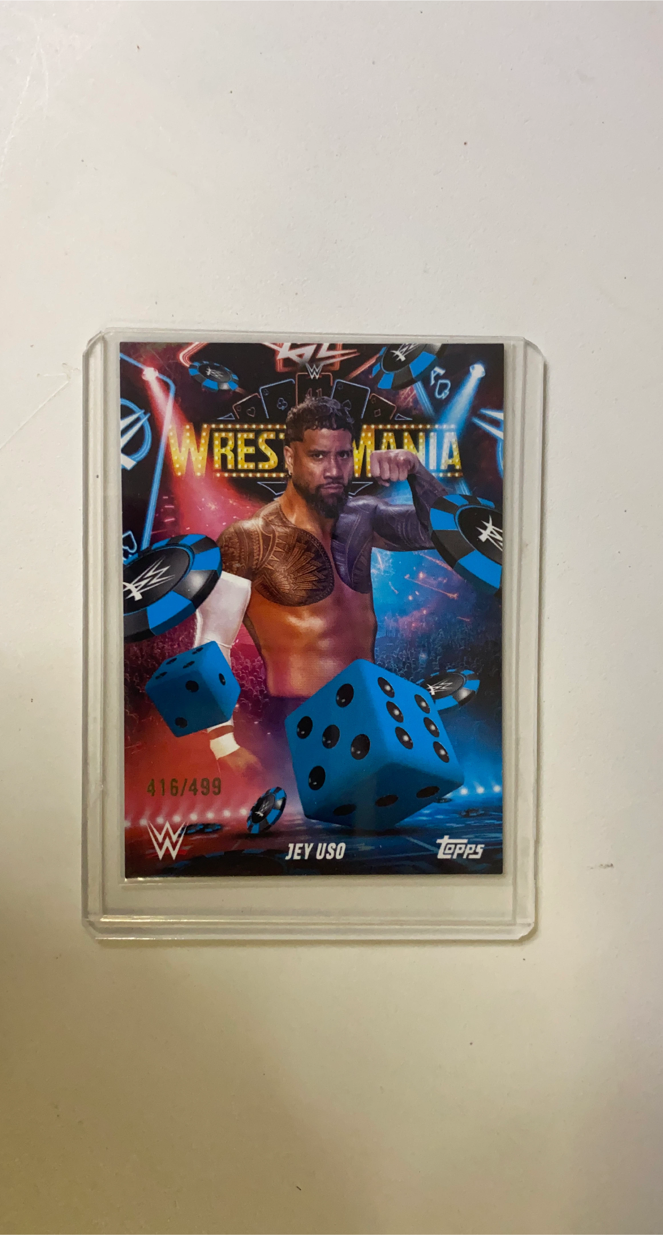 76Selling a Topps WWE Jey Uso Wrestlemania trading card. It's numbered 416/499.