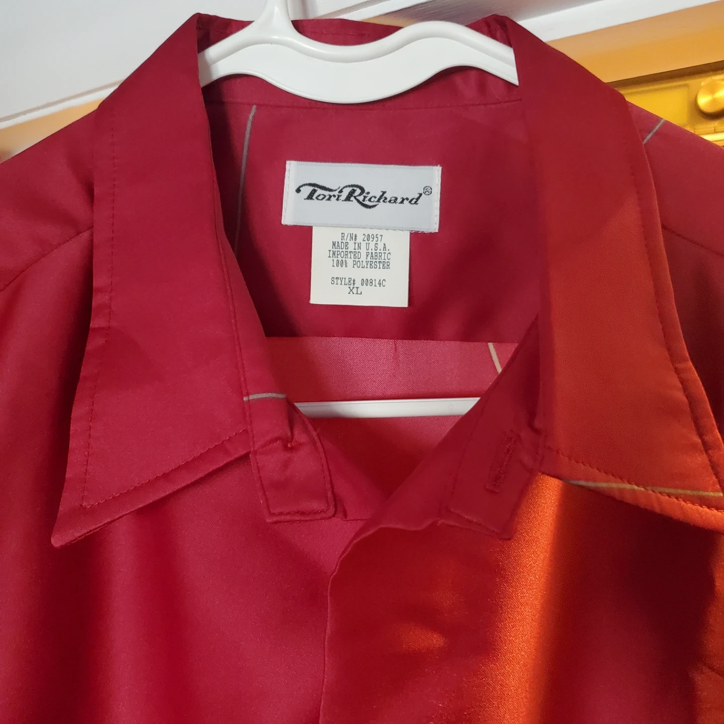 18Selling a Tori Richard red shirt in size XL. It's a silk blend material and features a unique design with cranes and bamboo. This shirt is in great condition and ready for a new home!
