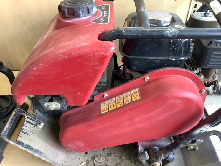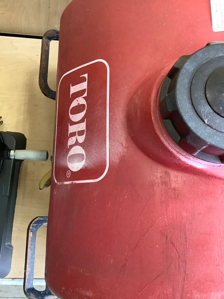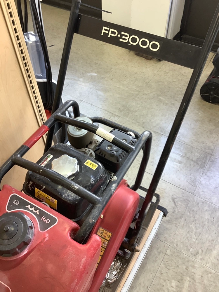 Toro FP-3000 Plate Compactor. Has a 4-cycle gas engine. Includes a fuel tank. The handle is adjustable and folds down.