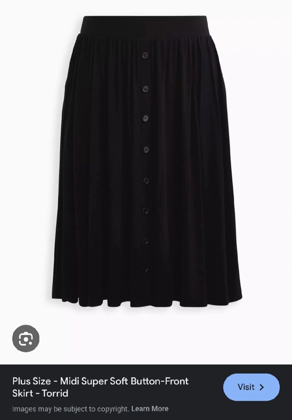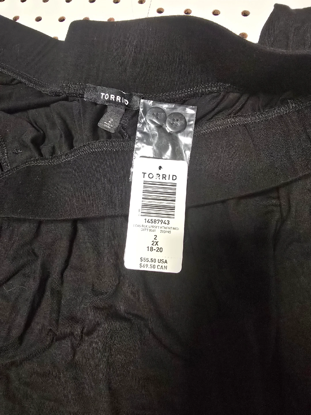 Selling a Torrid black midi skirt with a button-front design. It's a size 2X (18-20). Never worn and still with tags and extra button. Super soft and comfortable material! Originally bought for $55.50 USD.