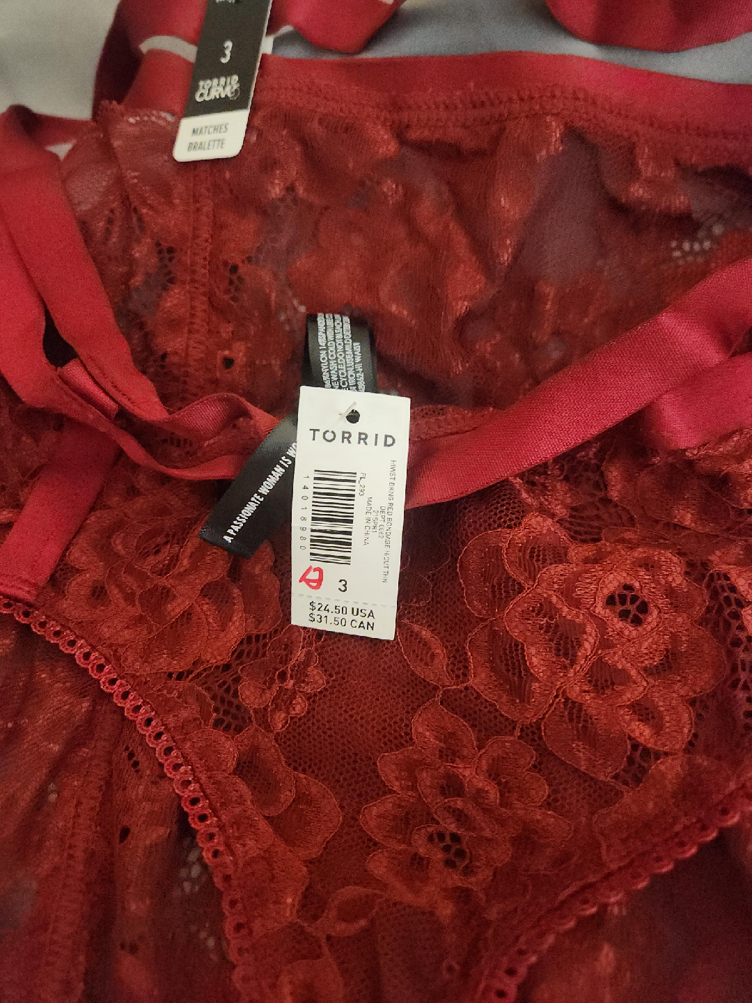 Selling a beautiful red lace lingerie piece from Torrid in size 3. It's in great condition and ready for a new home. The original price was $24.50 USD. Perfect for adding a touch of elegance to your wardrobe!