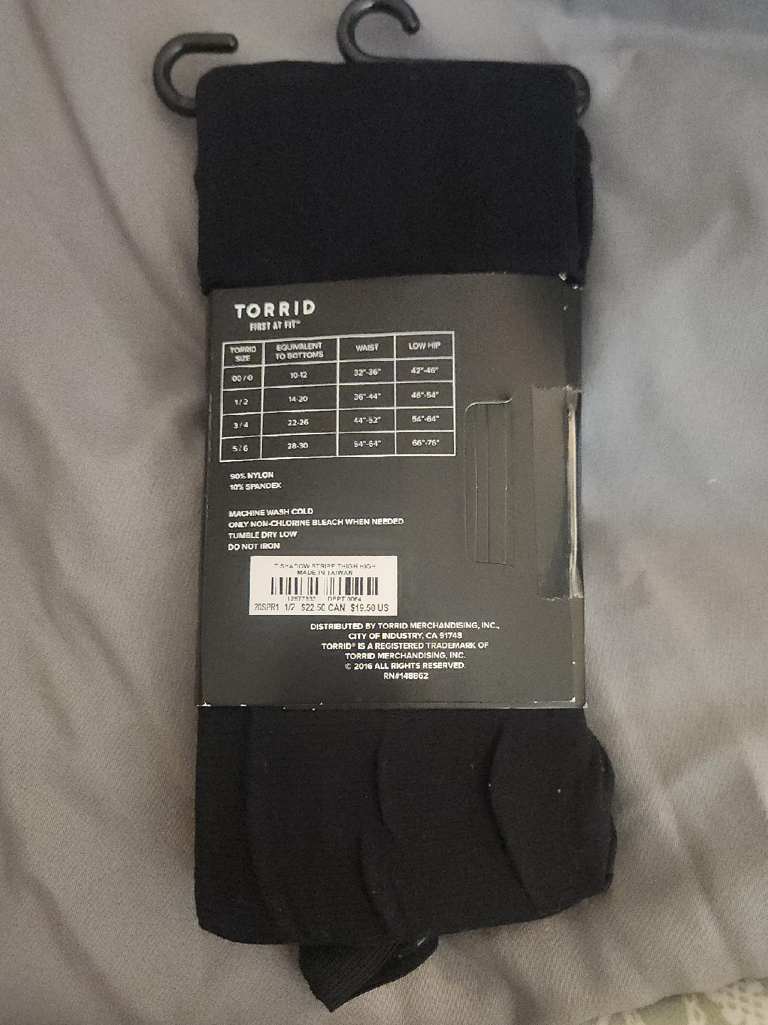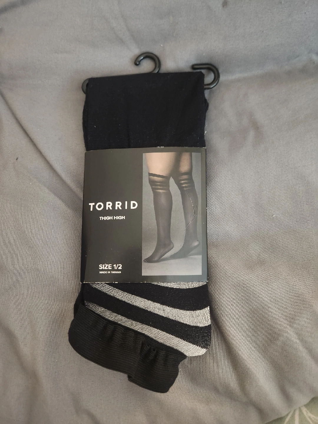 Selling a pair of Torrid thigh-high stockings in size 1/2. The original price was $15.50. They are made of 90% nylon and 10% spandex. Machine washable, cold. Only non-chlorine bleach when needed. Tumble dry low. Do not iron