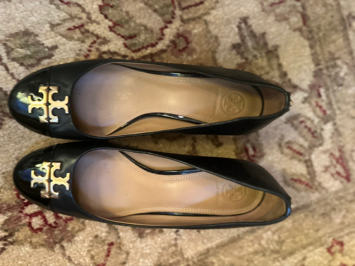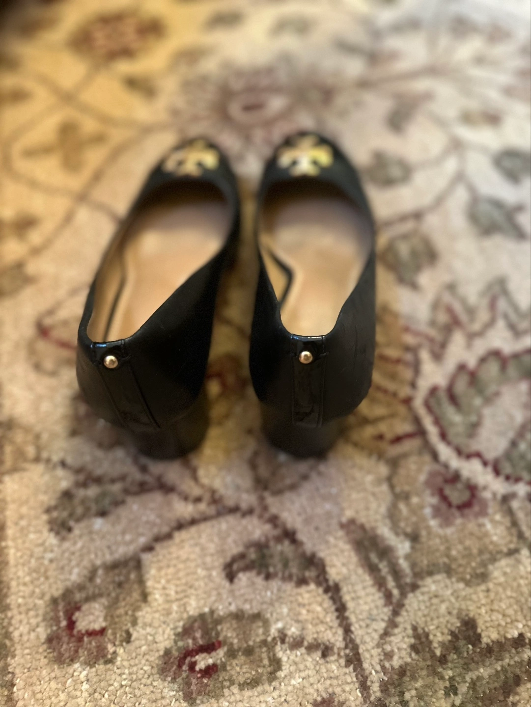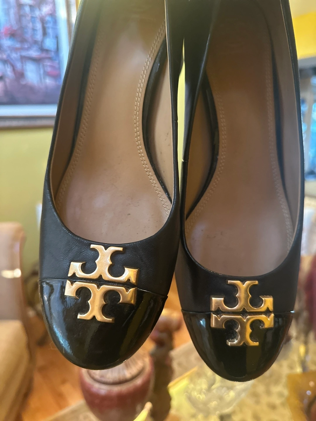 These are a pair of Tory Burch ballet flats in black leather. They feature the classic Tory Burch logo on the toe. They're in good condition and ready for a new home!