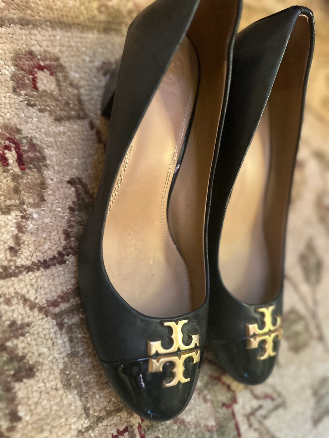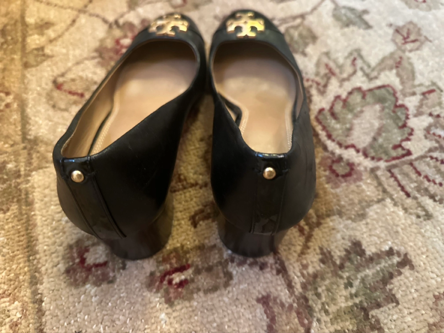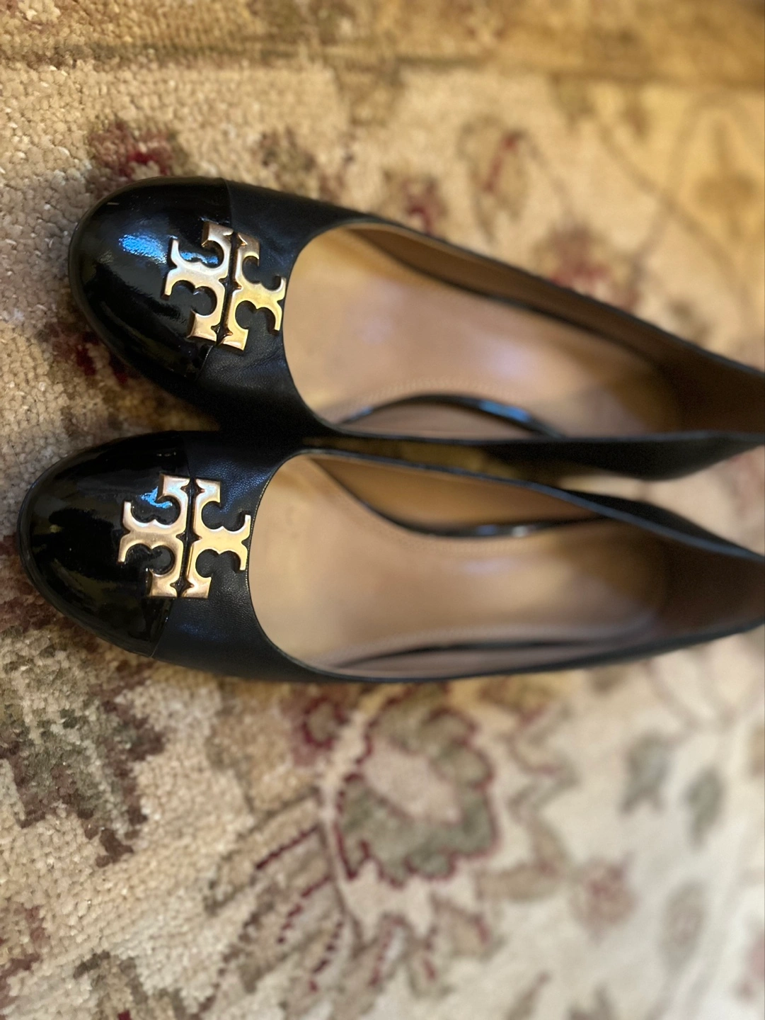 These are a pair of Tory Burch ballet flats in black leather. They feature the classic Tory Burch logo on the toe. They're in good condition and ready for a new home!
