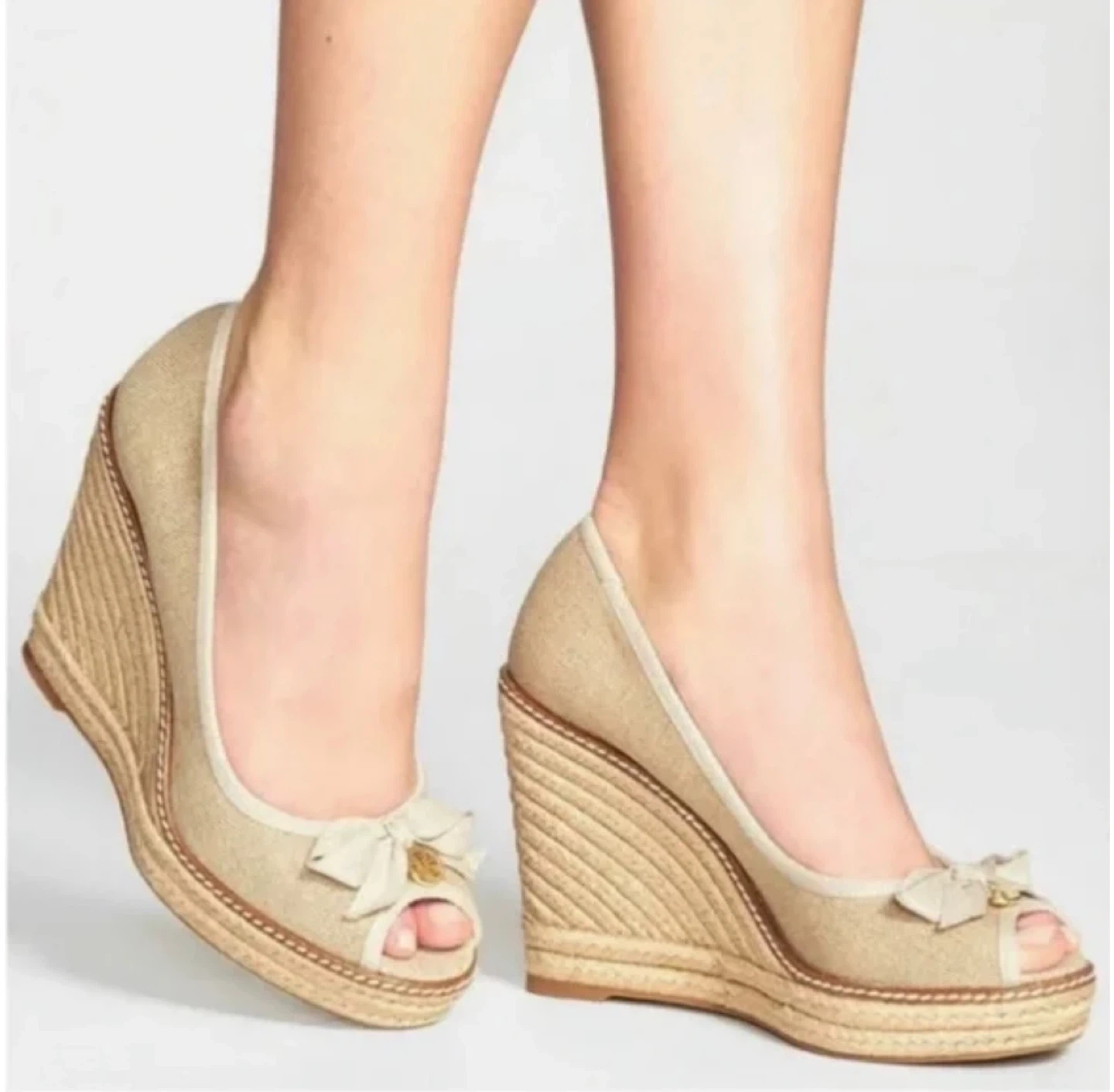 These Tory Burch espadrille wedge sandals are in great condition! They feature a peep-toe design with a cute bow detail and the iconic Tory Burch logo. Perfect for adding a touch of style to any outfit! The size is 7.5