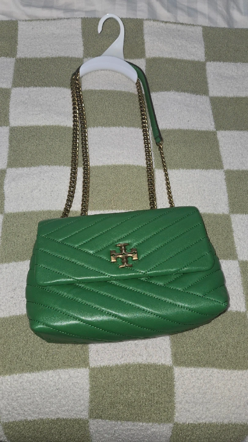 10This is a beautiful green leather shoulder bag from Tory Burch. It features a gold chain strap and a chevron quilted design. The bag is in great condition and perfect for everyday use!
