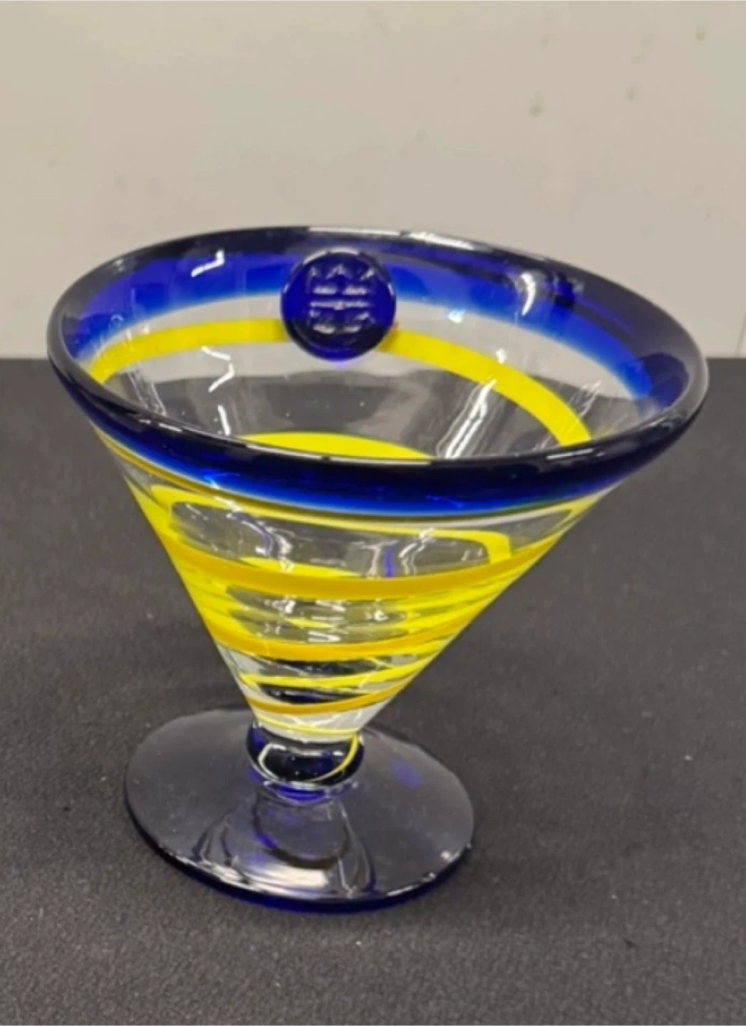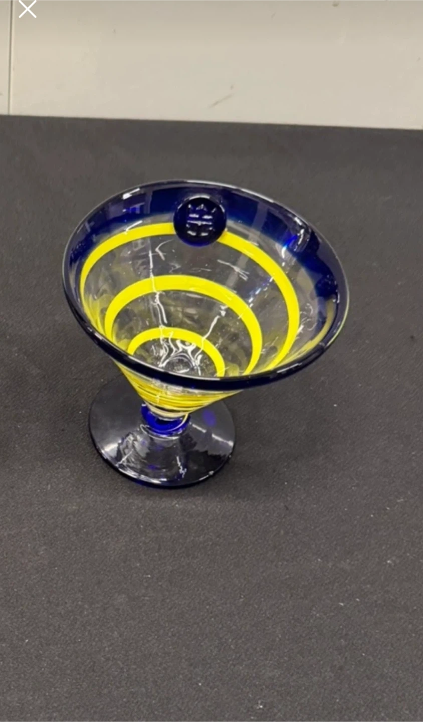 Here's a fun Tory Burch martini glass! It features a vibrant blue rim and base, complemented by a playful yellow spiral design inside the glass. Perfect for adding a pop of color to your barware collection
