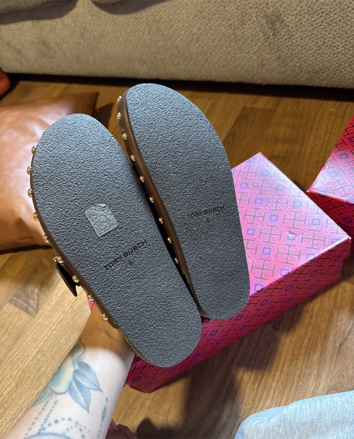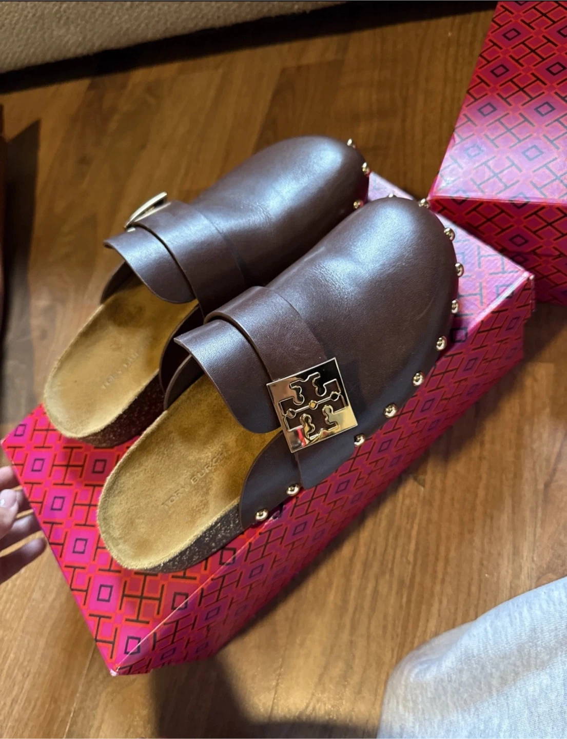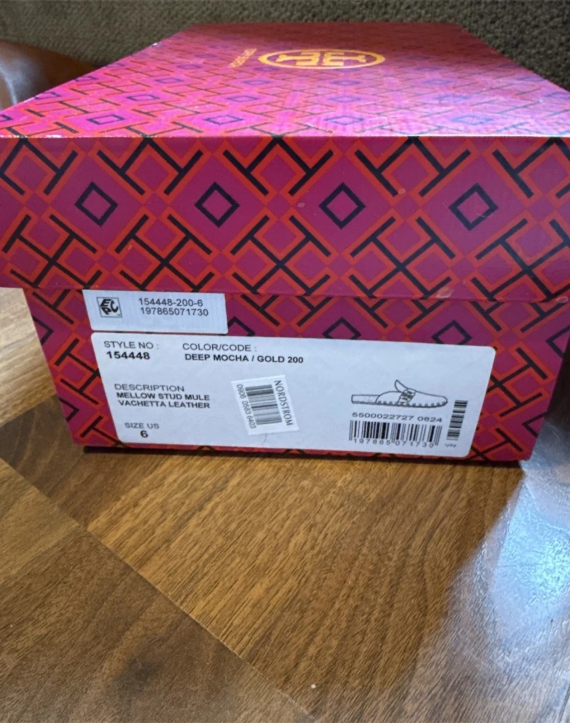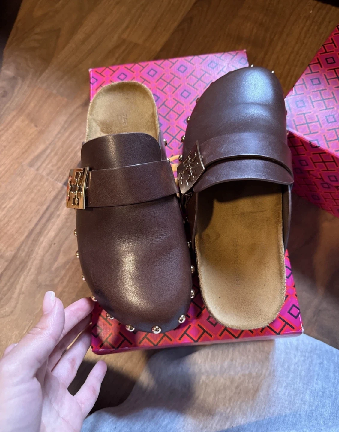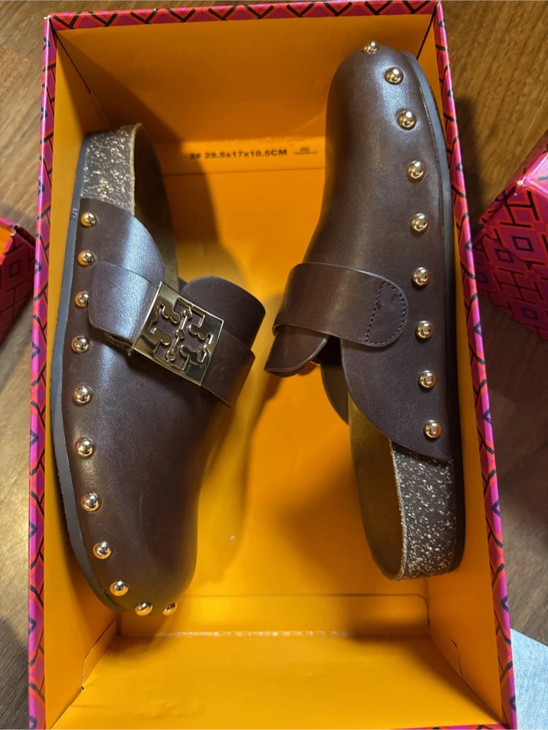 Selling a pair of Tory Burch Mellow Stud Mules in size 6. Comes with the original box. The color is Deep Mocha/Gold 200. stylish mules.