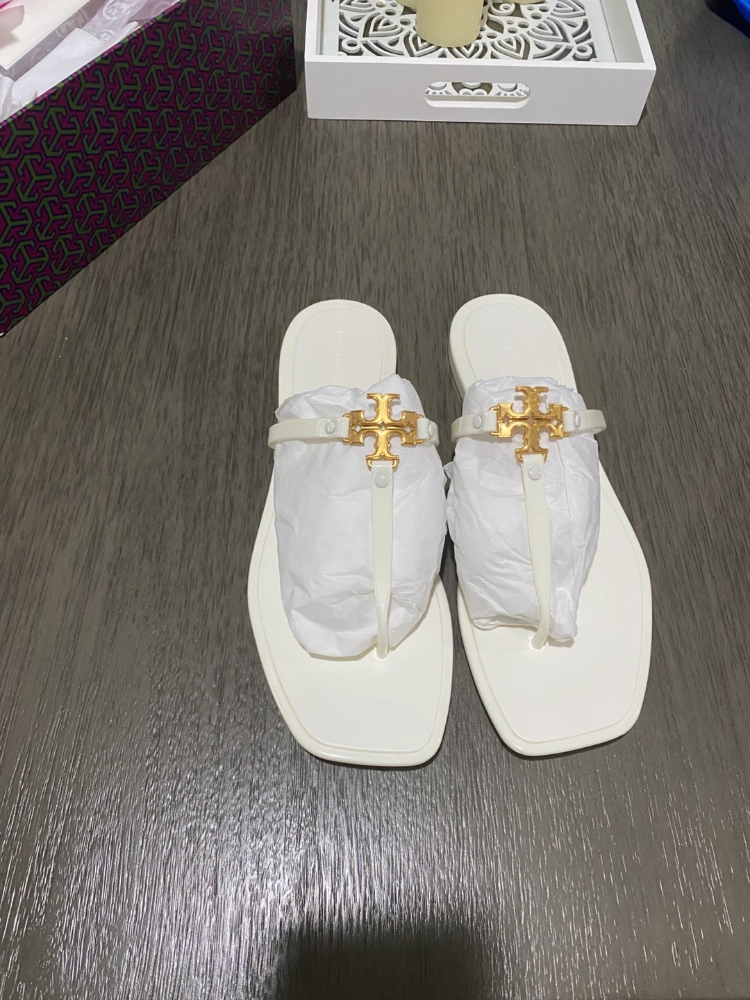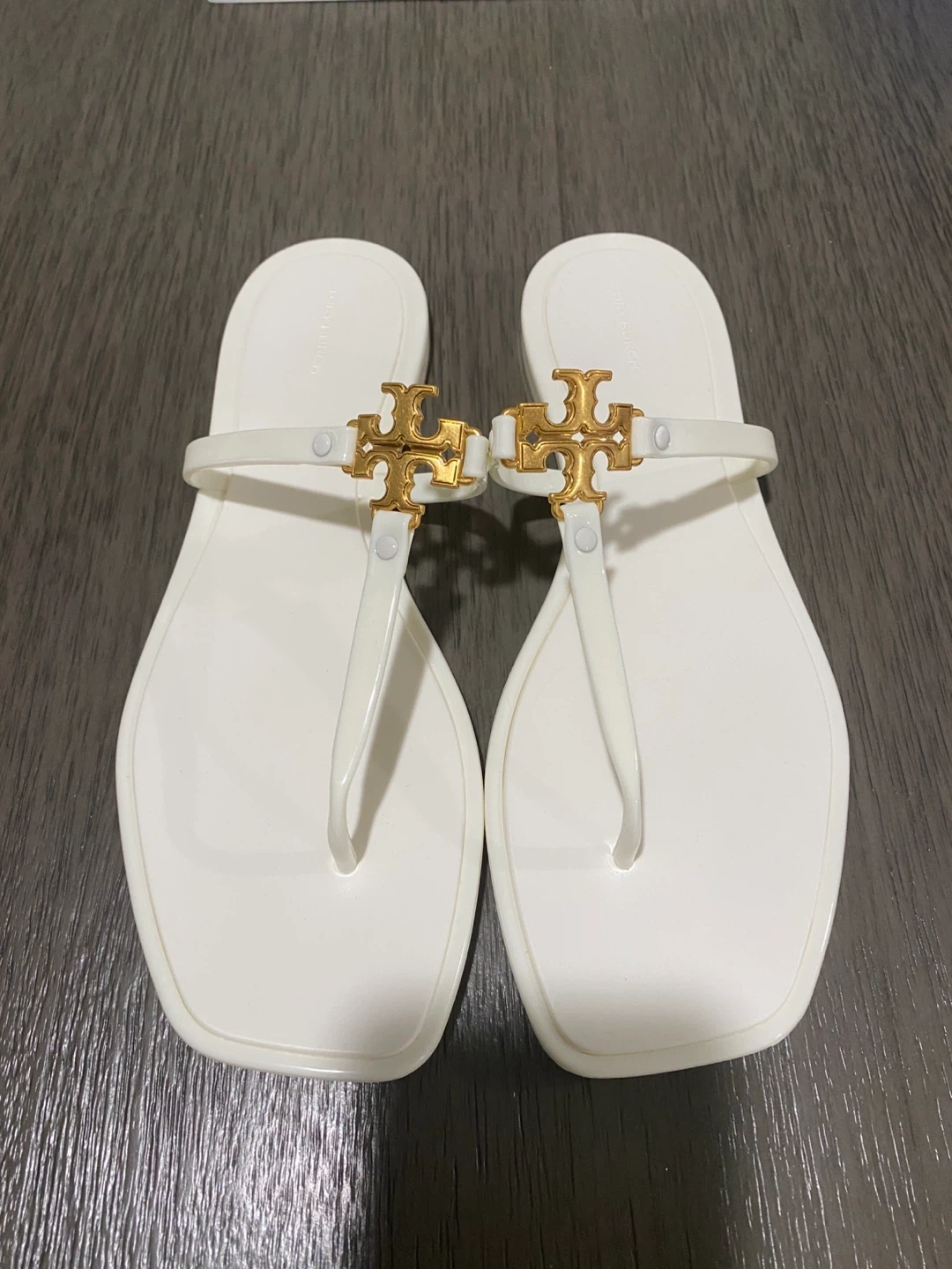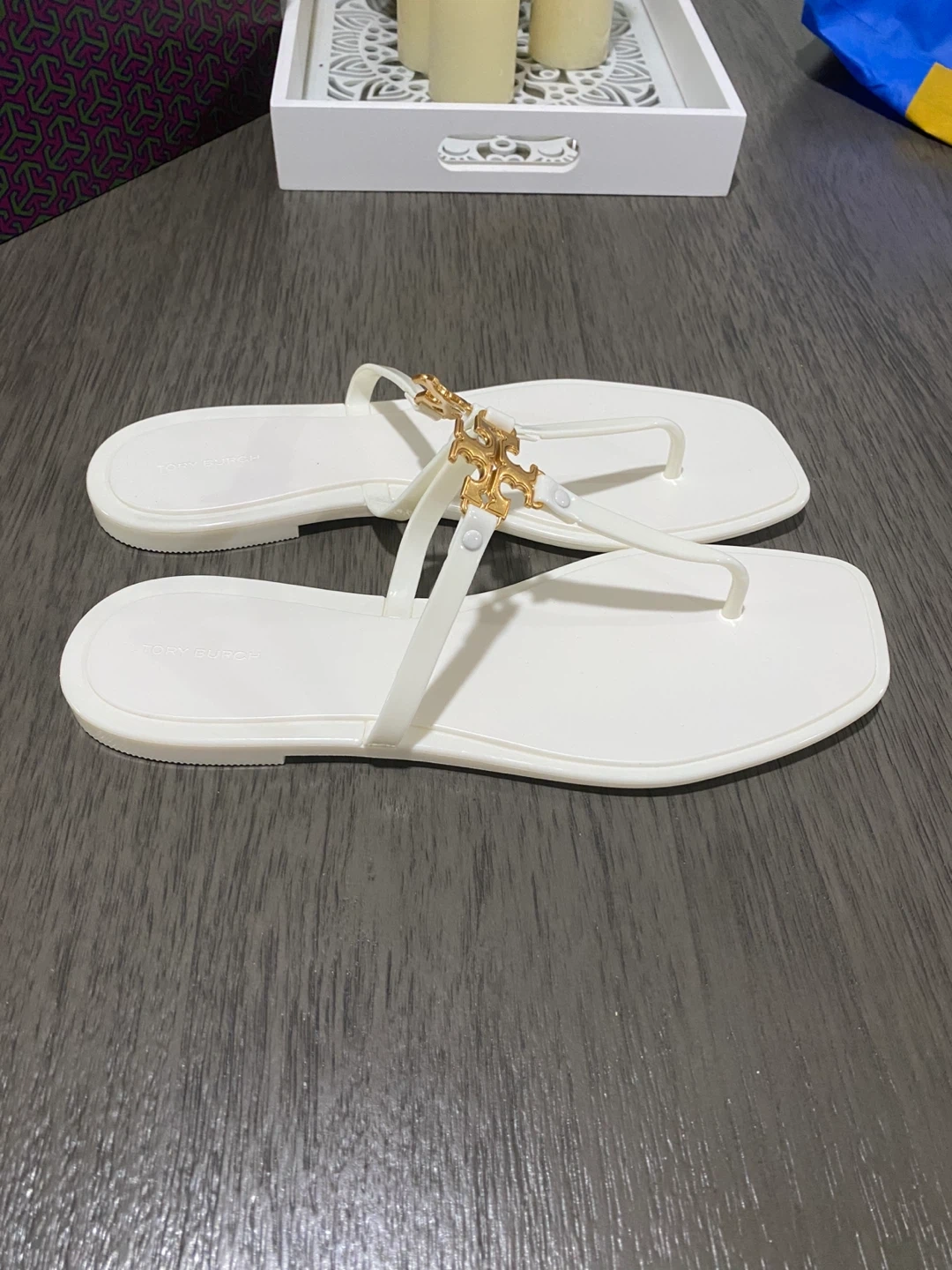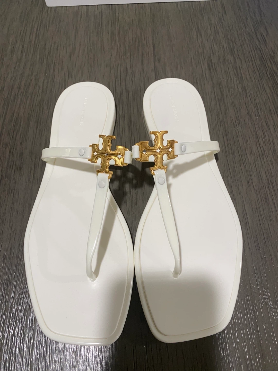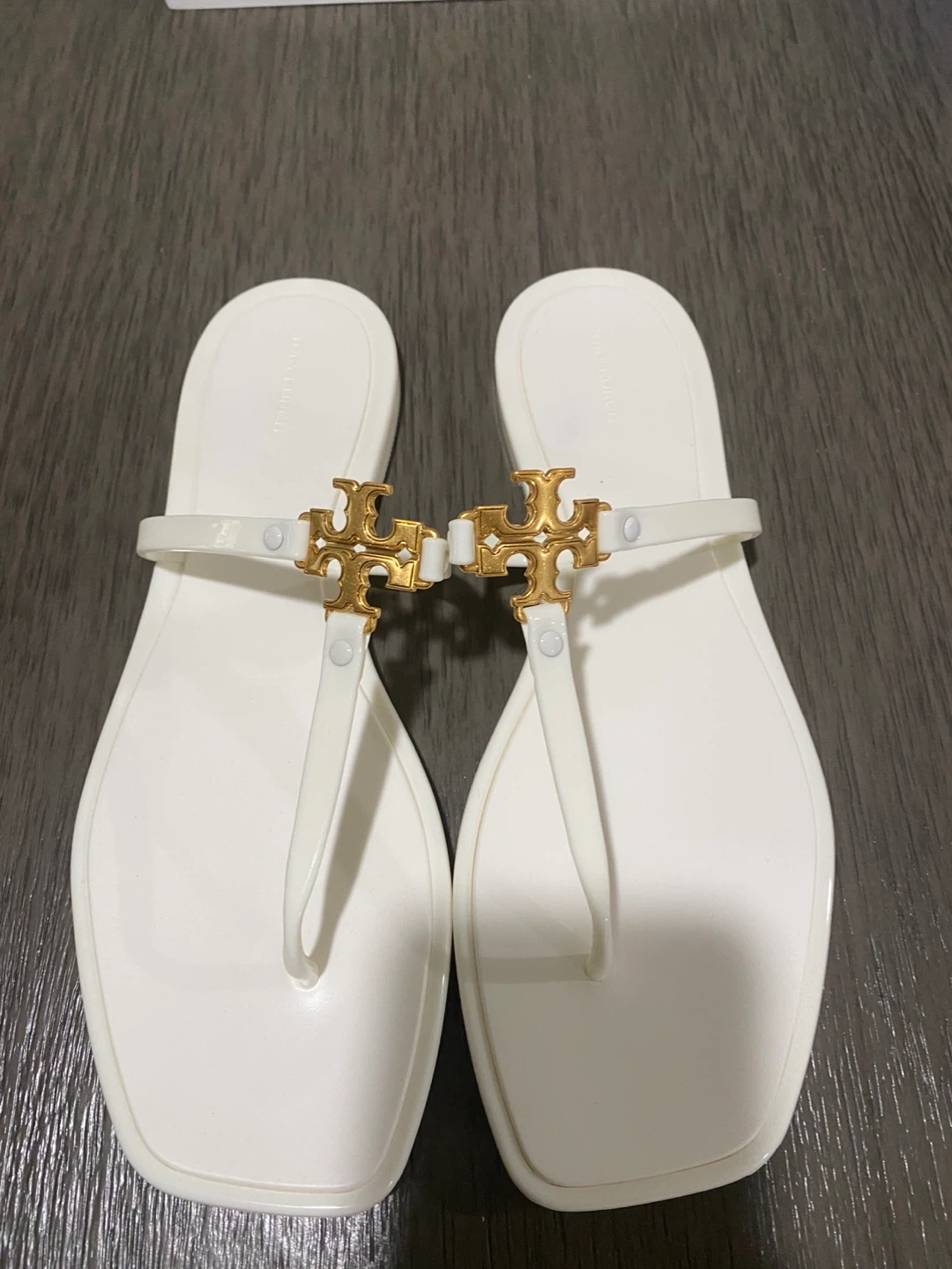 These are a pair of Tory Burch Roxxane jelly thong sandals in white. They feature the iconic Tory Burch logo in gold. These sandals are perfect for a casual day out or a trip to the beach!