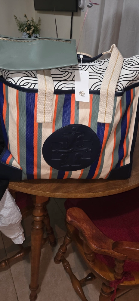 This is a cute Tory Burch tote bag with a striped design! It's perfect for carrying your everyday essentials in style. The bag features the iconic Tory Burch logo and has a spacious interior. It's in great condition and ready for a new home