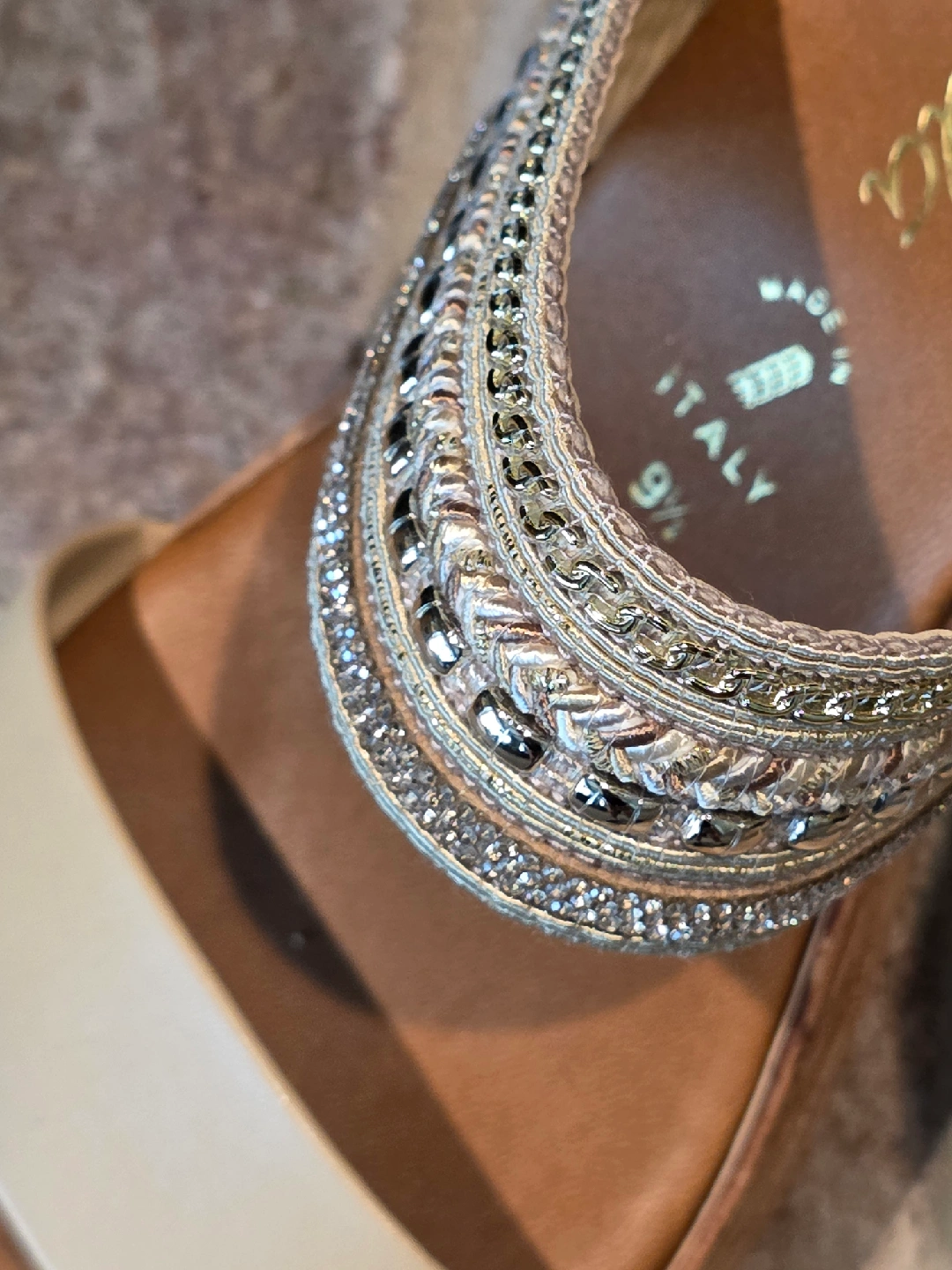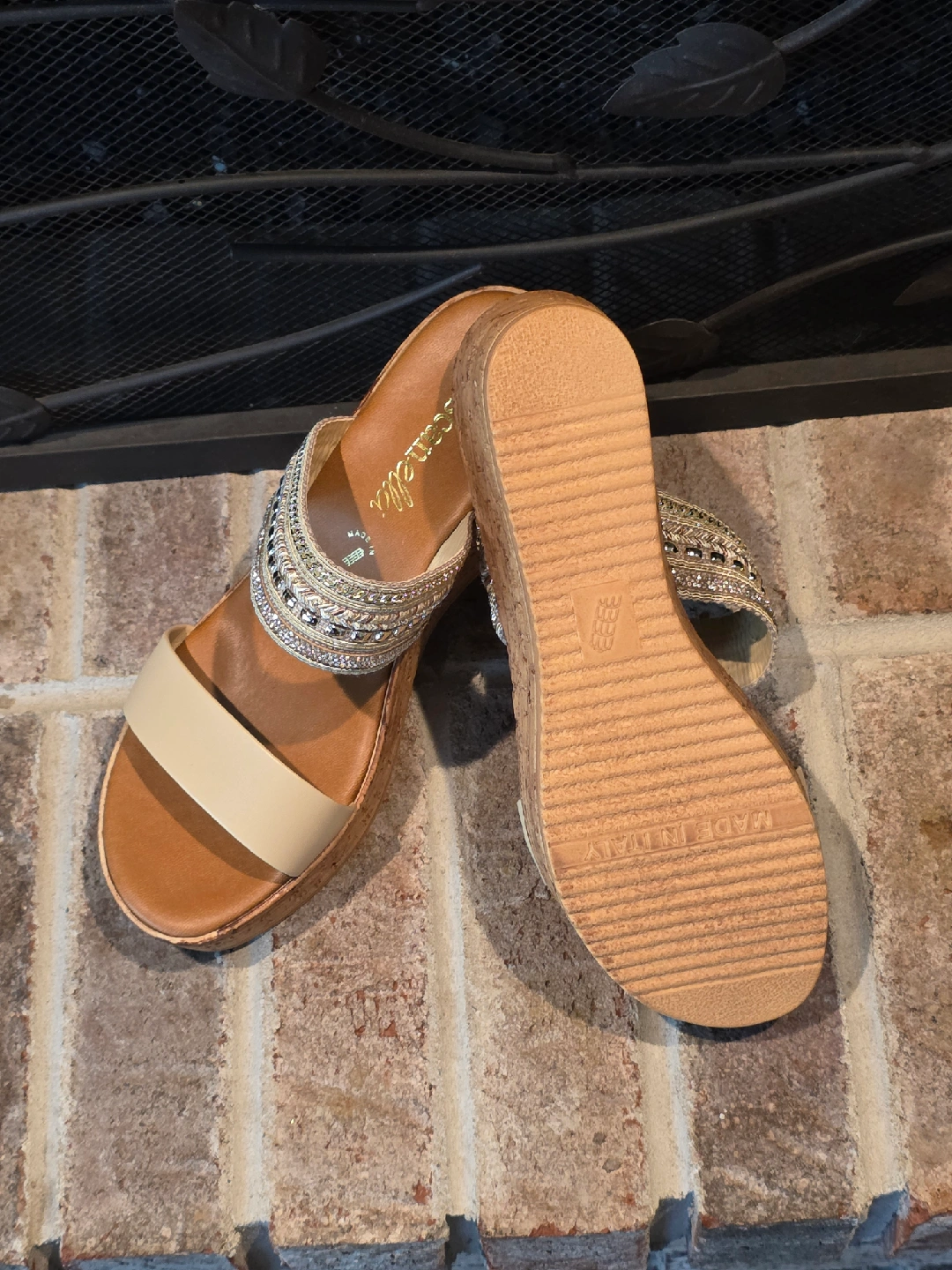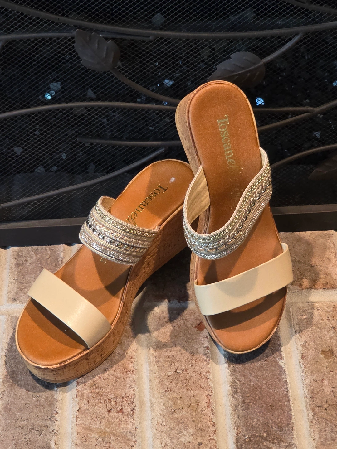 These Toscanella sandals are a size 9.5. They were made in Italy and have a beautiful beaded design. The platform is made of cork. Pick up in Naperville near naper blvd and 87th street or near downtown Naperville off of Chicago and Charles