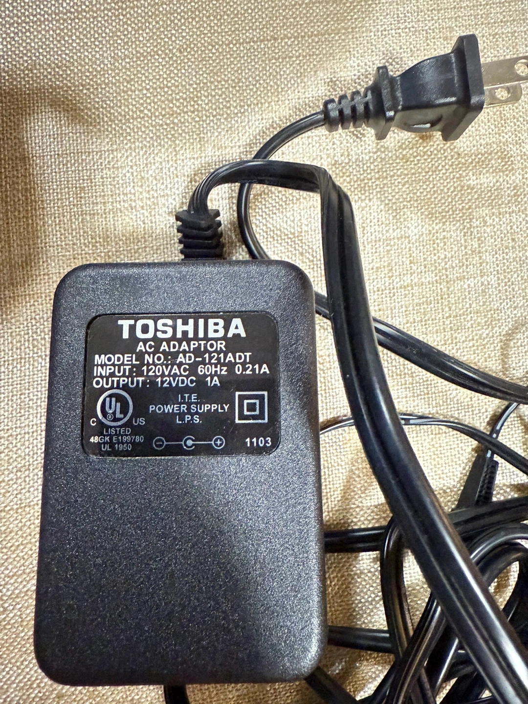 165Selling a Toshiba AC Adaptor, model AD-121ADT. It's an AC adaptor with input of 120VAC 60Hz 0.21A and output of 12VDC 1A.