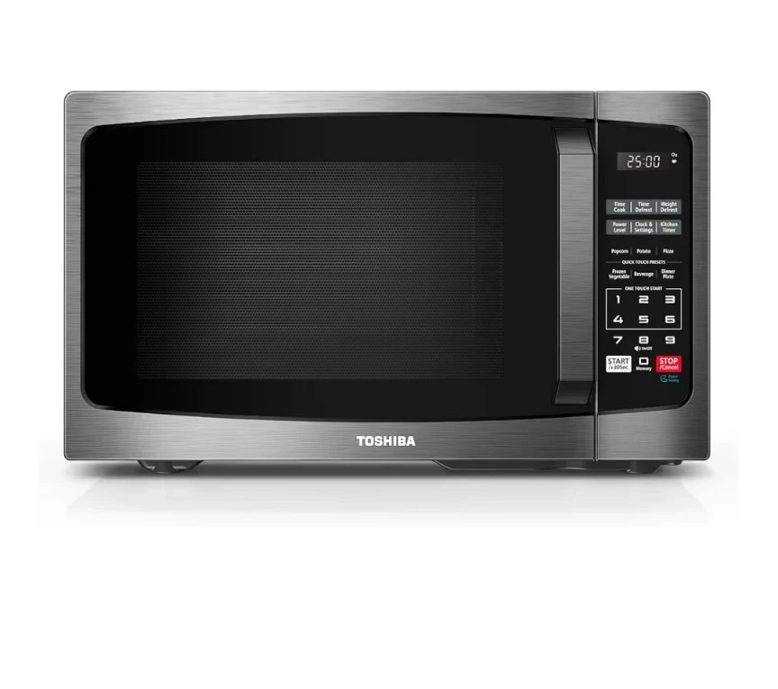 60Selling a Toshiba microwave oven in great condition! It features quick touch presets for popcorn, potato, frozen vegetables, beverages, and dinner plates. It also has time cook, time defrost, and weight defrost functions. There are number pad buttons for easy time setting and a start/stop button