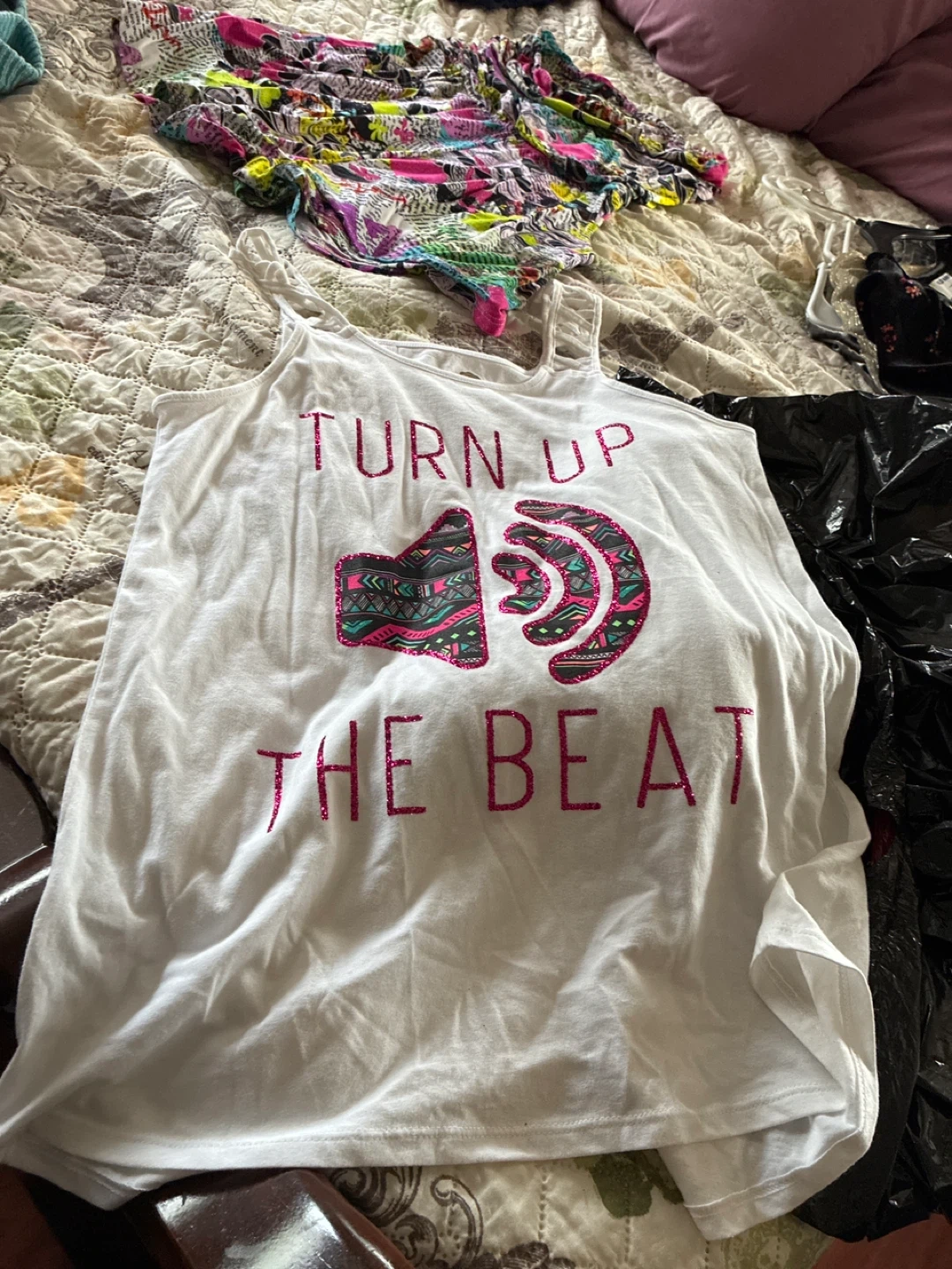 Selling a white tank top from Total Girl. It's a size L (14 1/2 - 16 1/2 PLUS). The material is 60% cotton and 40% polyester. It has a fun design that says "Turn Up The Beat"!