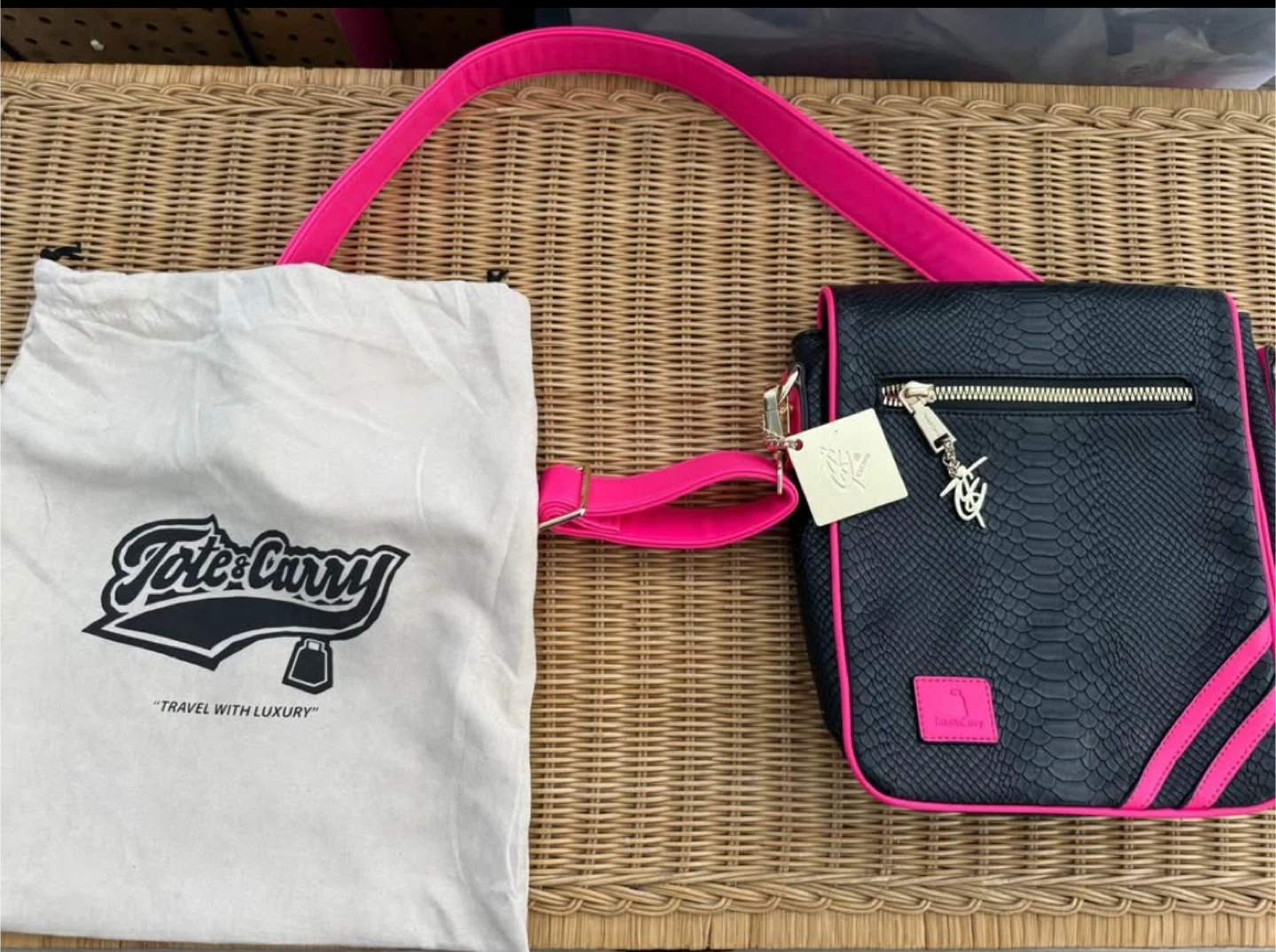 This is a Tote and Carry Brand crossbody bag in black with pink accents. It has a snakeskin-like texture and comes with its original dust bag!