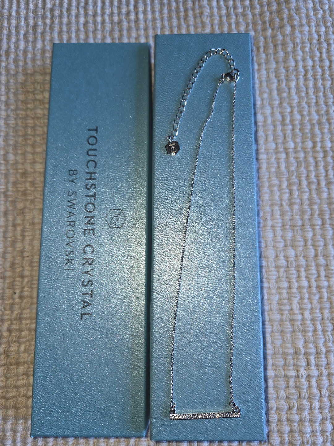 Selling a Touchstone Crystal by Swarovski necklace. It's in excellent condition and comes with its original box! The necklace features a delicate chain and a sparkling crystal bar pendant, perfect for adding a touch of elegance to any outfit. Pickup in Lindenwood only.