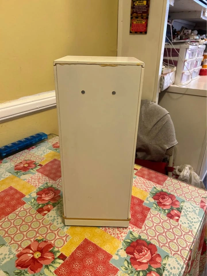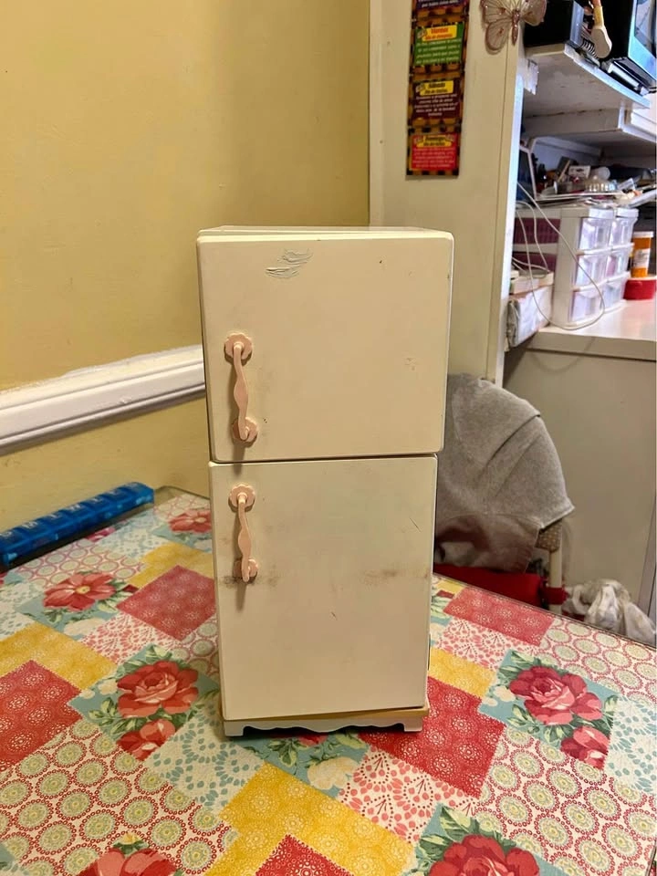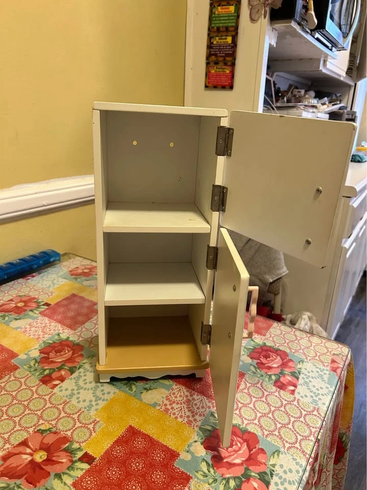 Small wooden toy refrigerator with 2 shelves and a working door. Perfect for pretend play or as a vintage display piece.