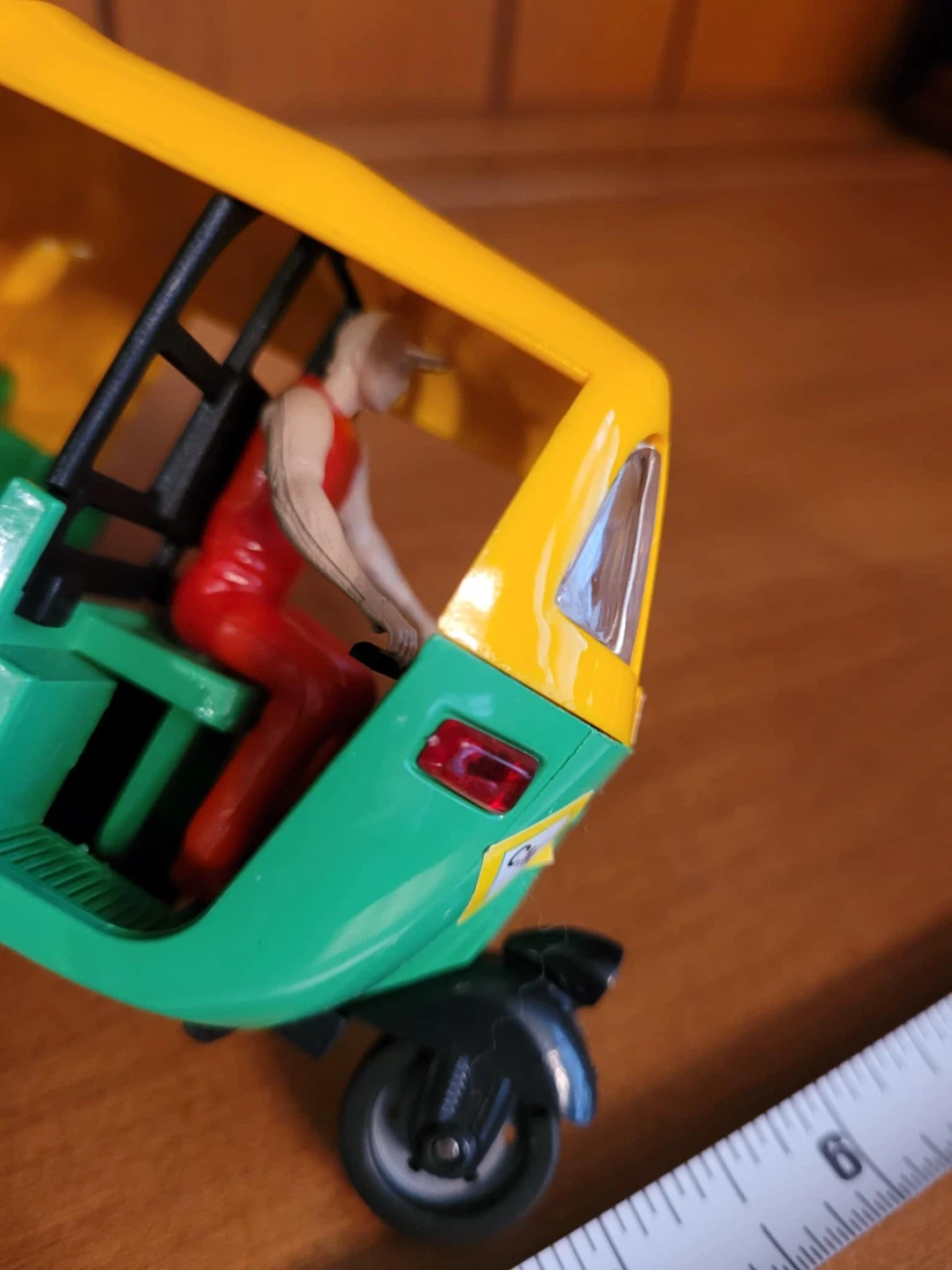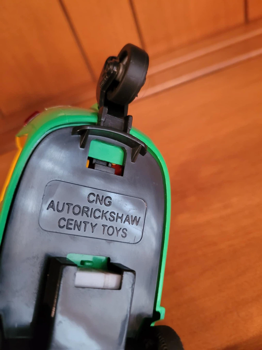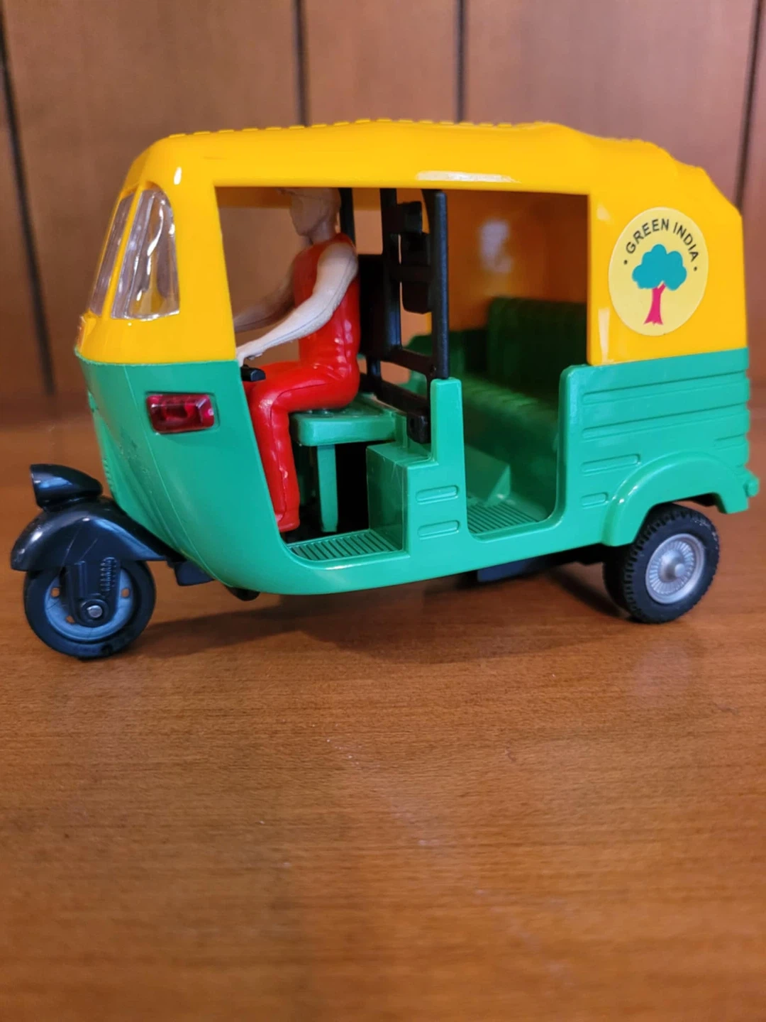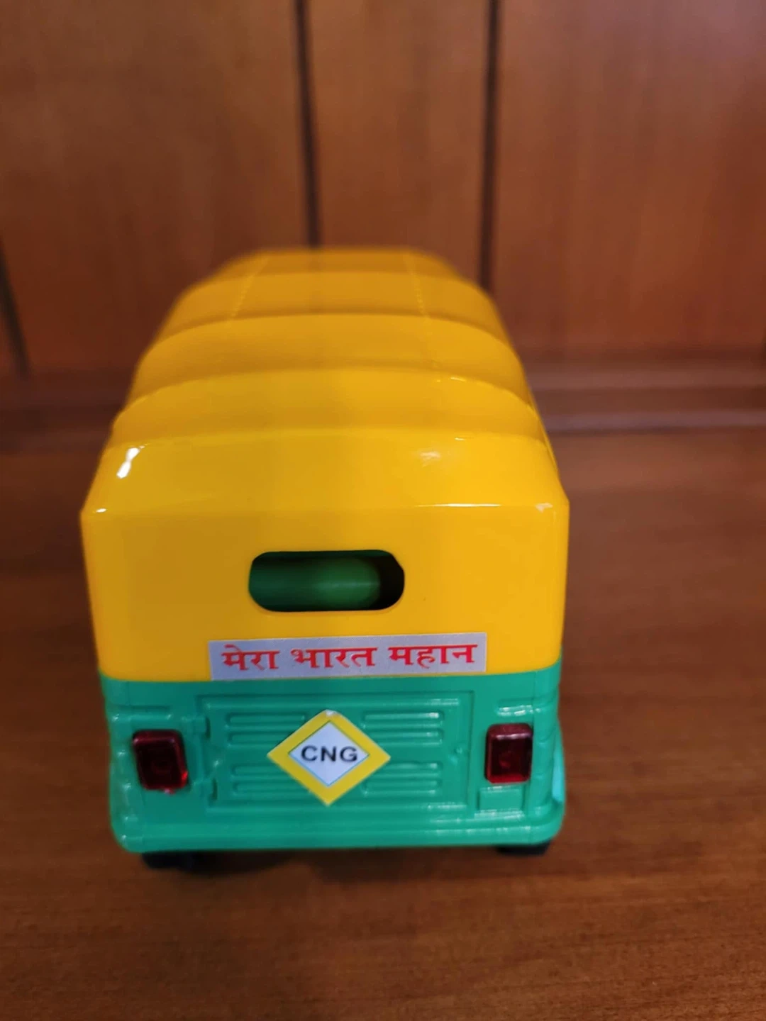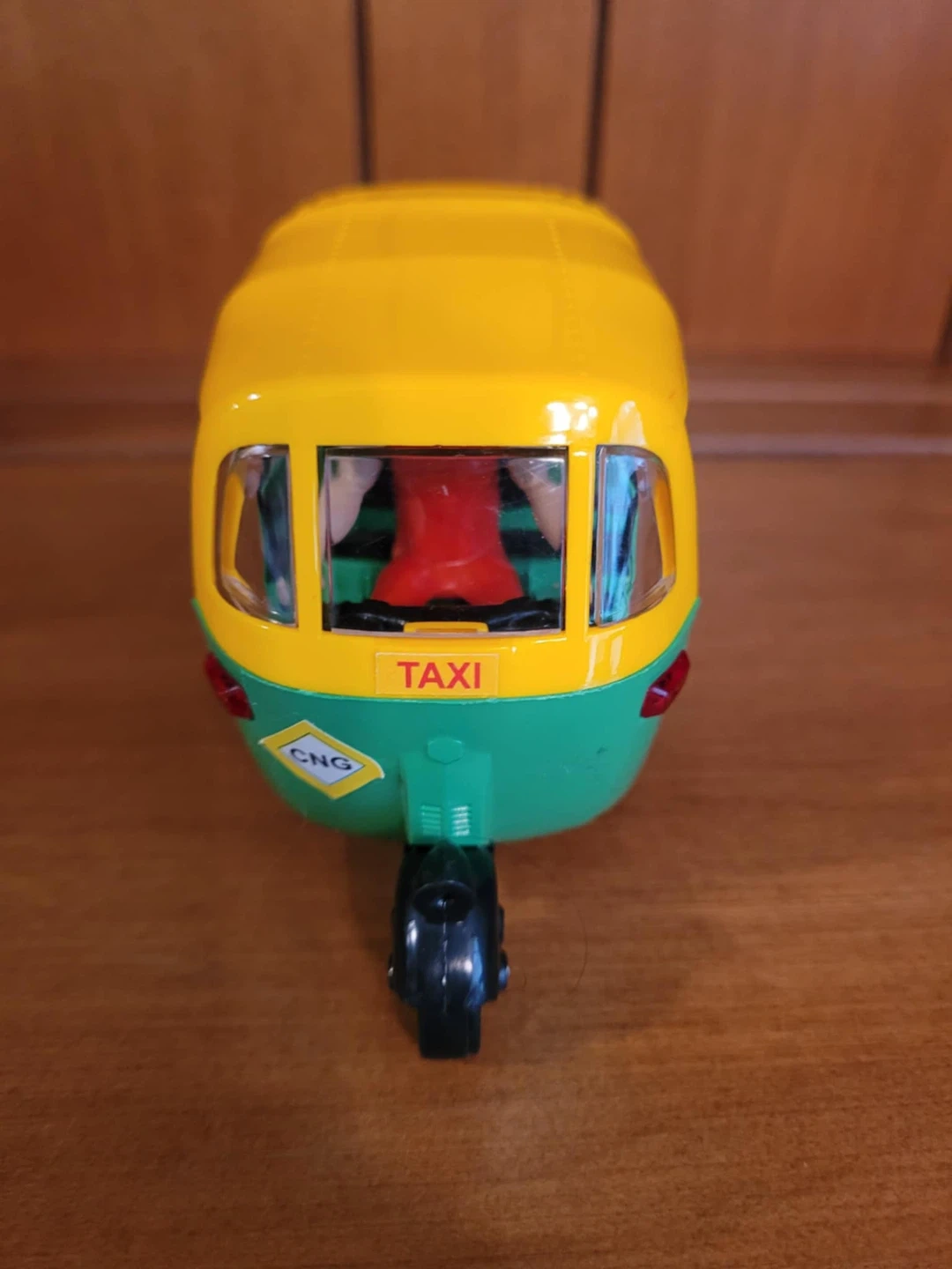 Selling a cute toy taxi rickshaw! It's colored yellow and green, with the text 'TAXI' and 'CNG' on it. There's also a 'Green India' logo on the side