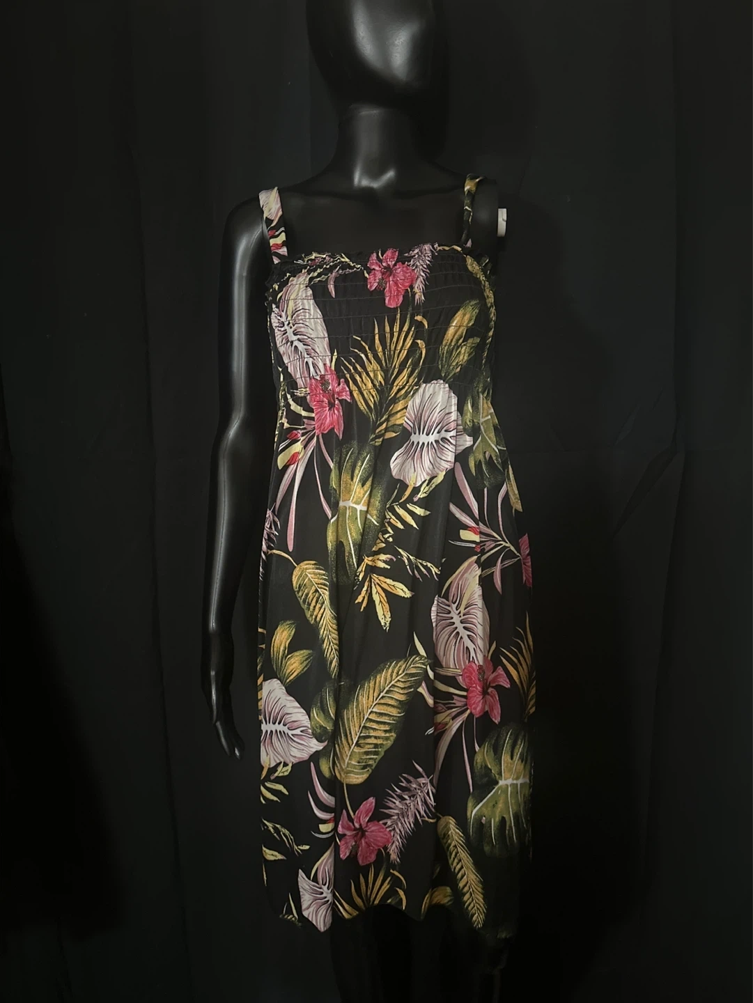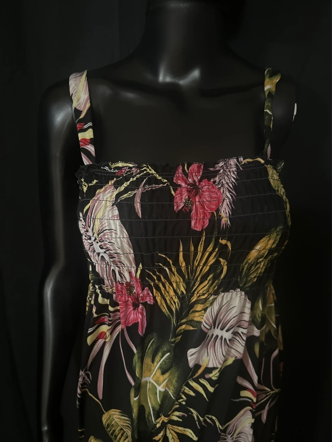 This sleeveless sundress features a vibrant floral print on a black background. It has a smocked bodice and adjustable spaghetti straps for a comfortable fit. It's made of a lightweight fabric, perfect for warm weather!