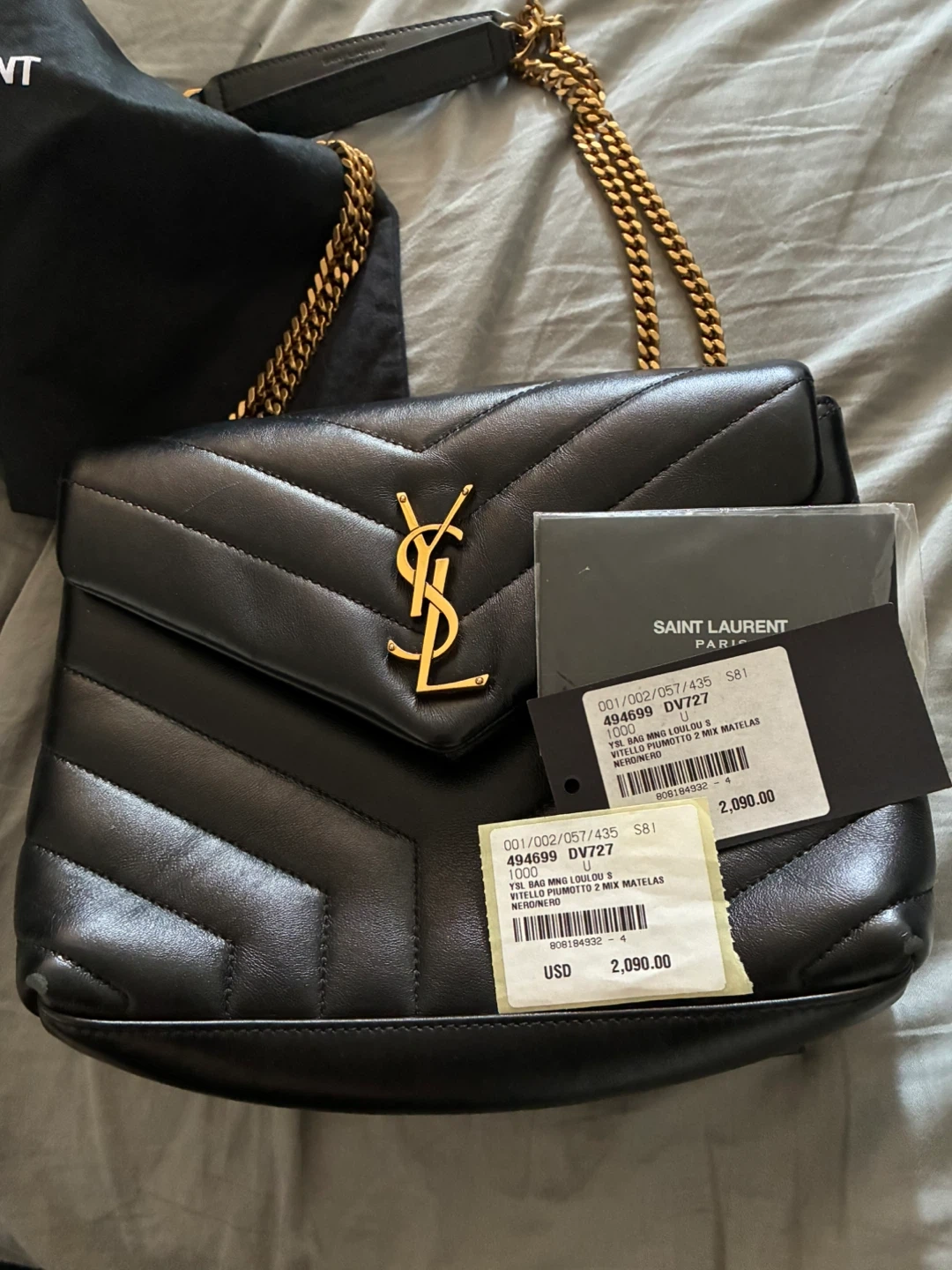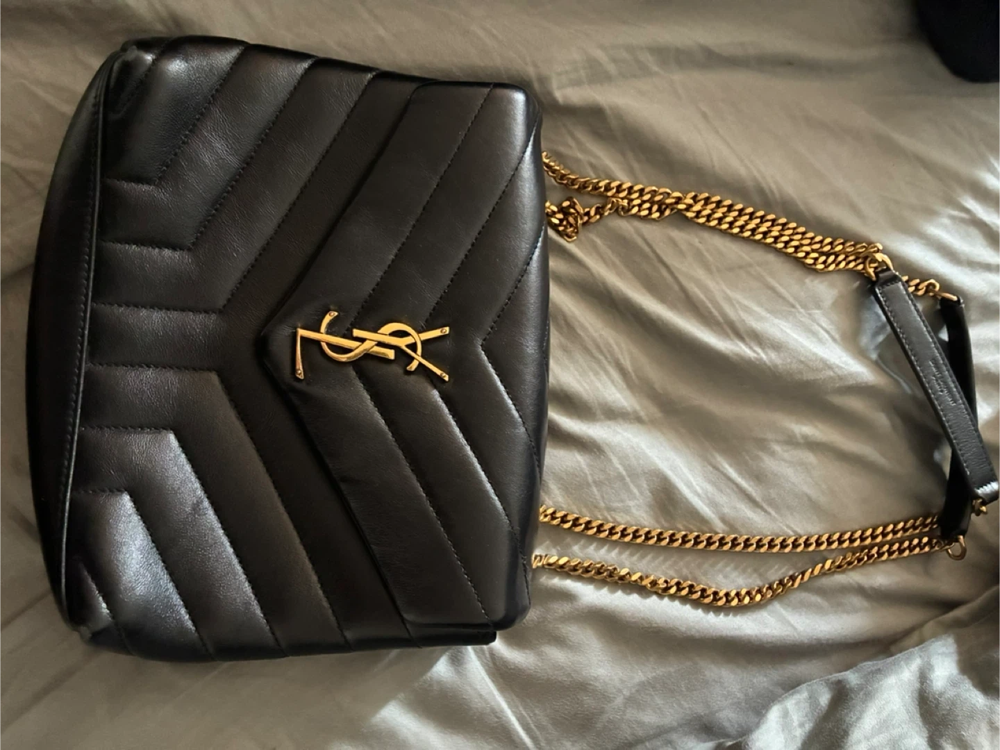 This is a Saint Laurent black leather shoulder bag with chevron quilting and a gold-tone YSL logo. It features a gold chain strap and a zippered interior pocket. The bag comes with its original dust bag and authenticity cards.