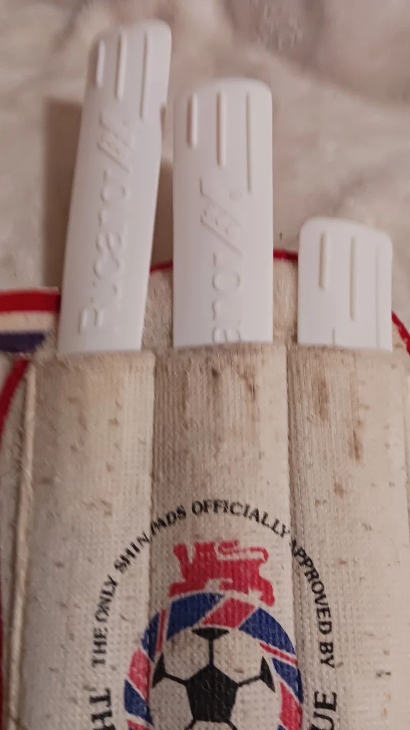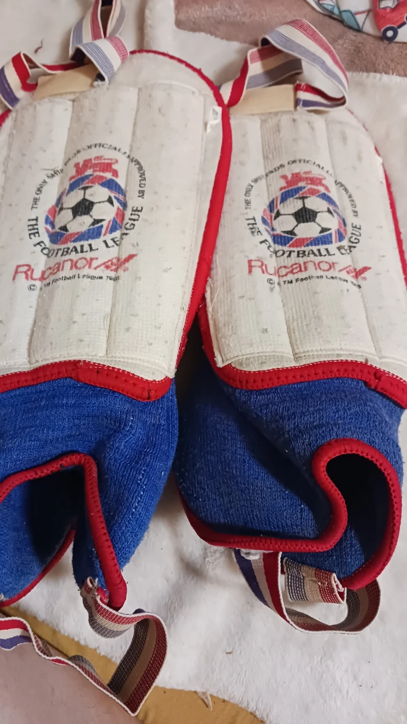 Vintage shin pads from The Football League. These protective pads feature adjustable straps for a secure fit. Ankle guards and removable slats for cleaning the guards. Officially approved and dated 1986.