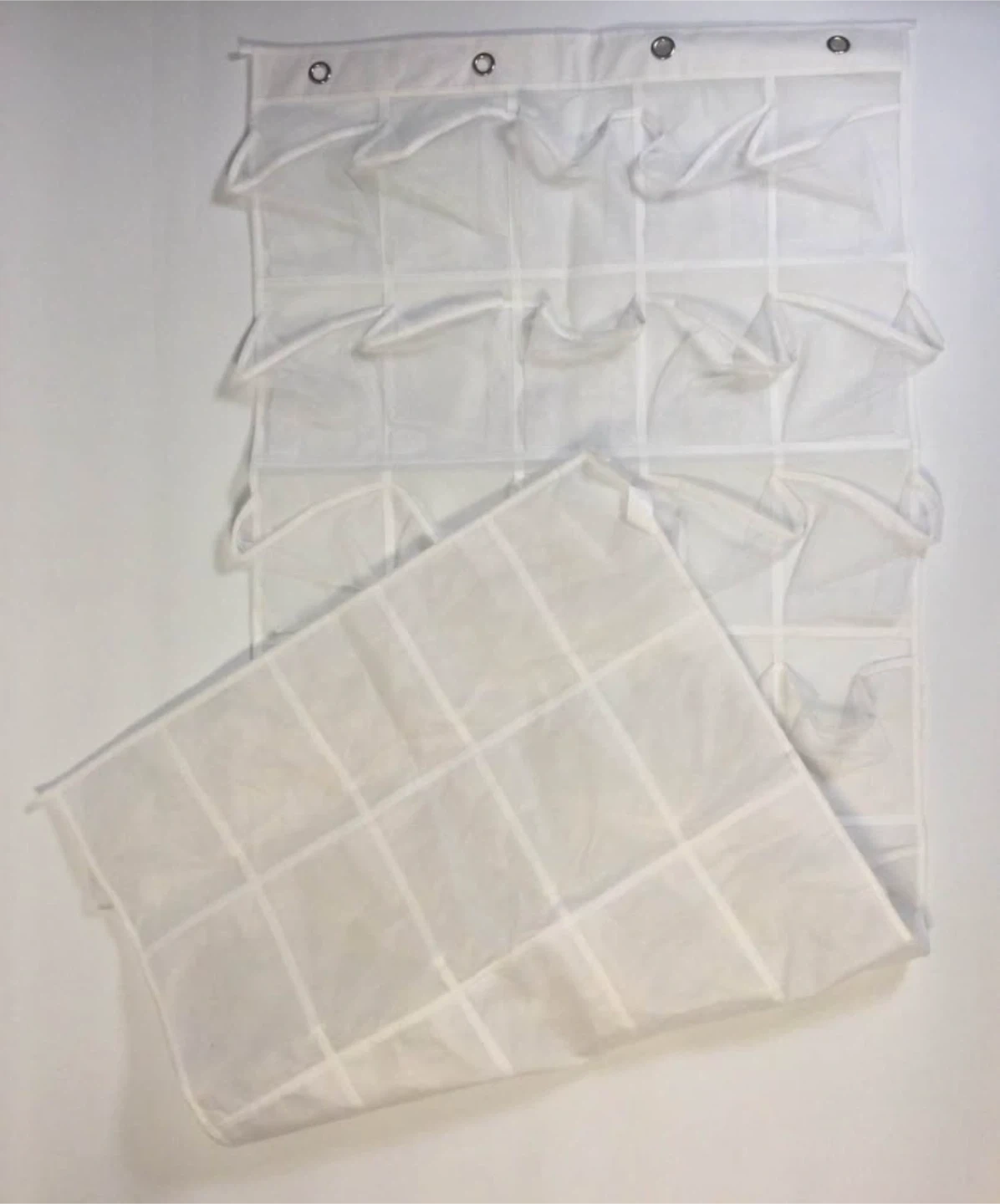 Handy white mesh hanging organizer. 61 x 26 inches. Lots of pockets for storage. Super useful for closets or doors.