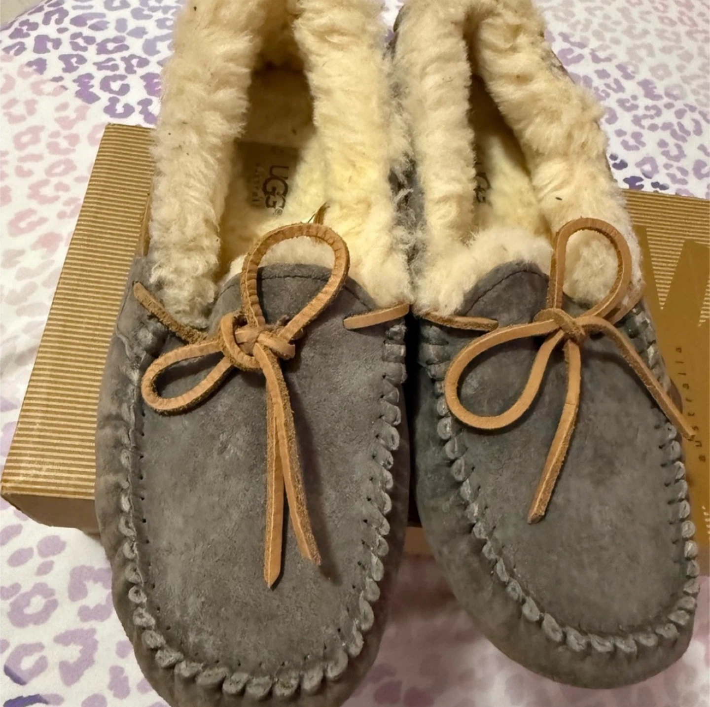 Selling a pair of UGG Dakota moccasin slippers in size 6. They're in good condition and come with the original box. These cozy slippers are perfect for keeping your feet warm and comfortable!