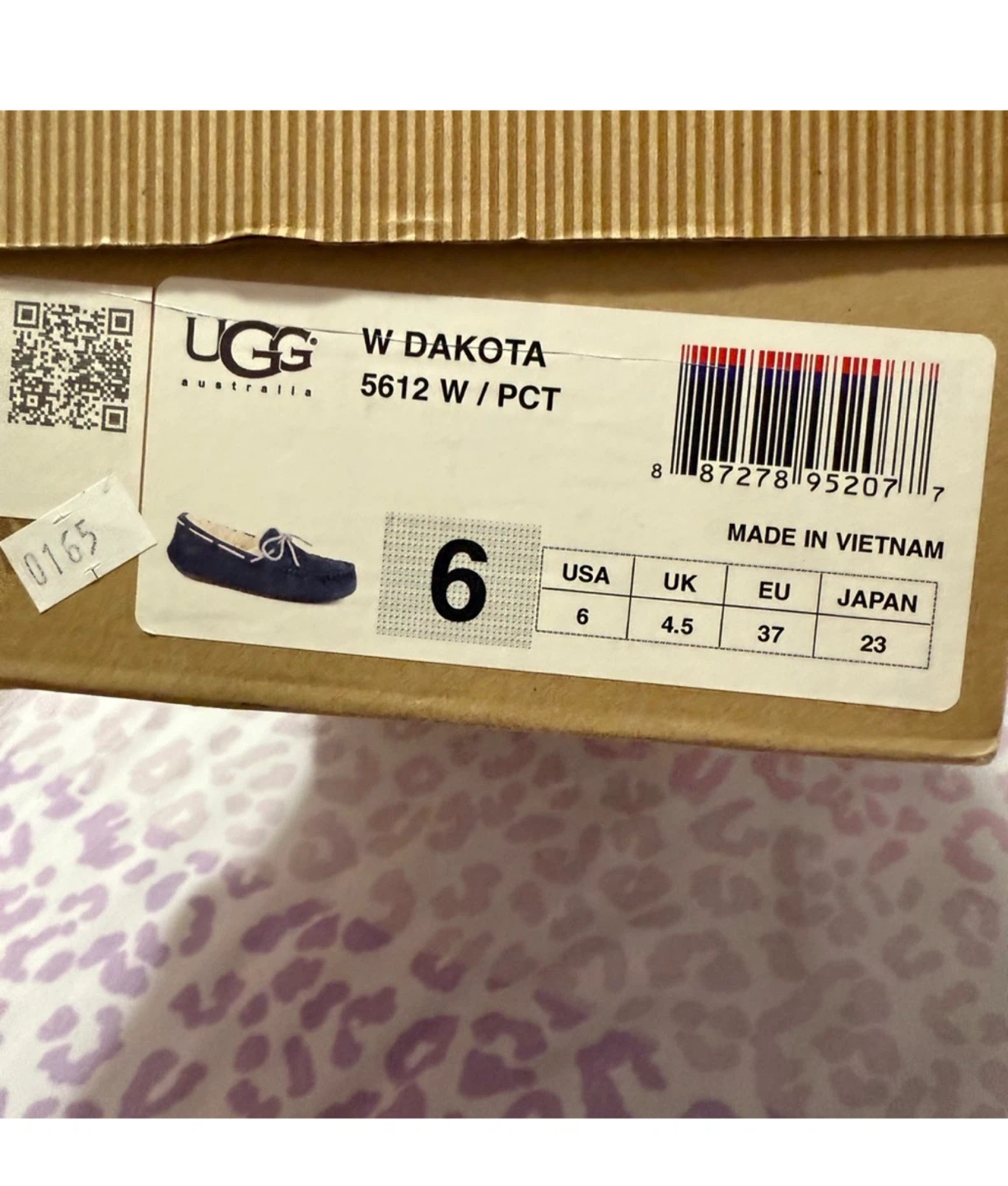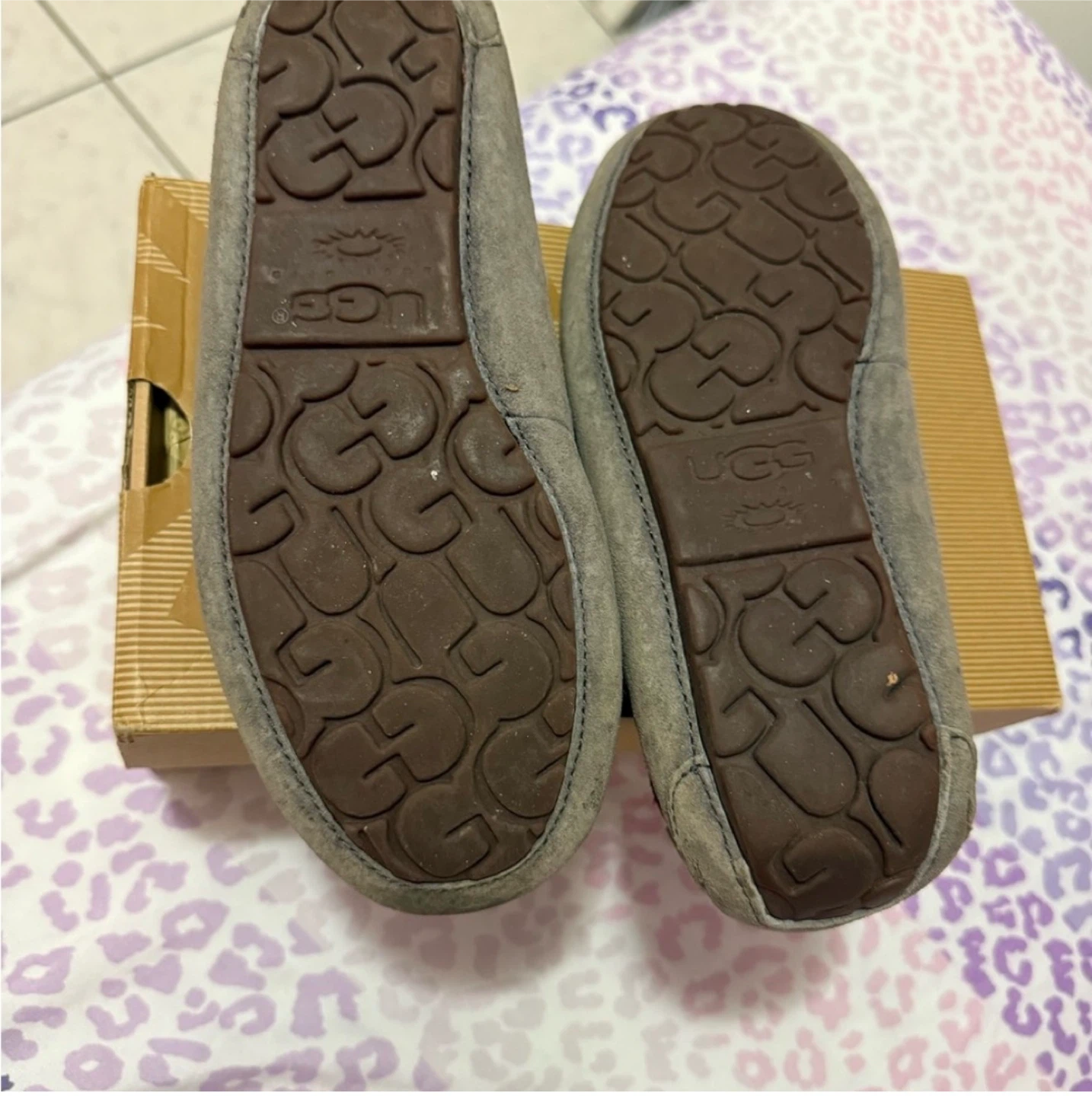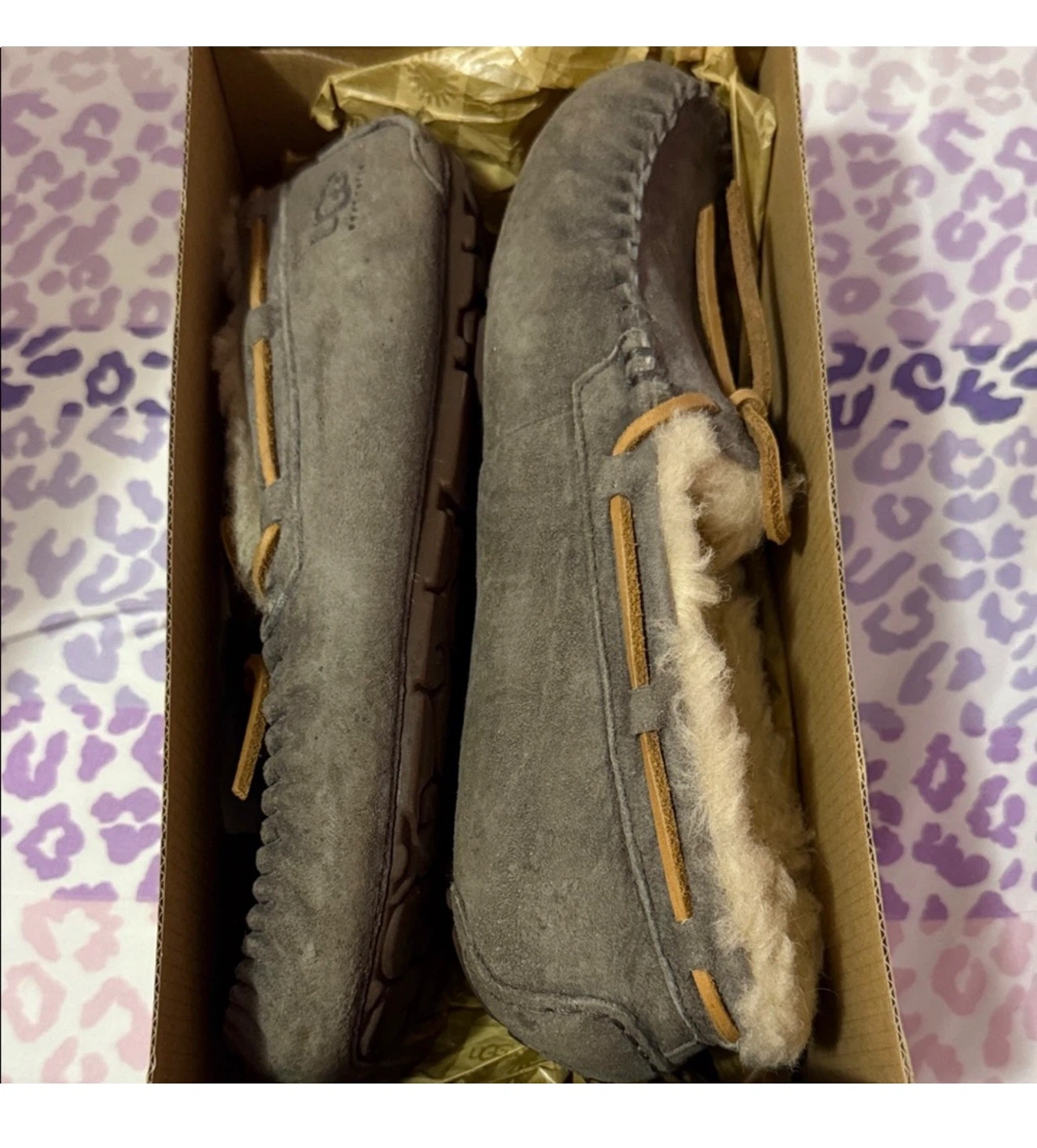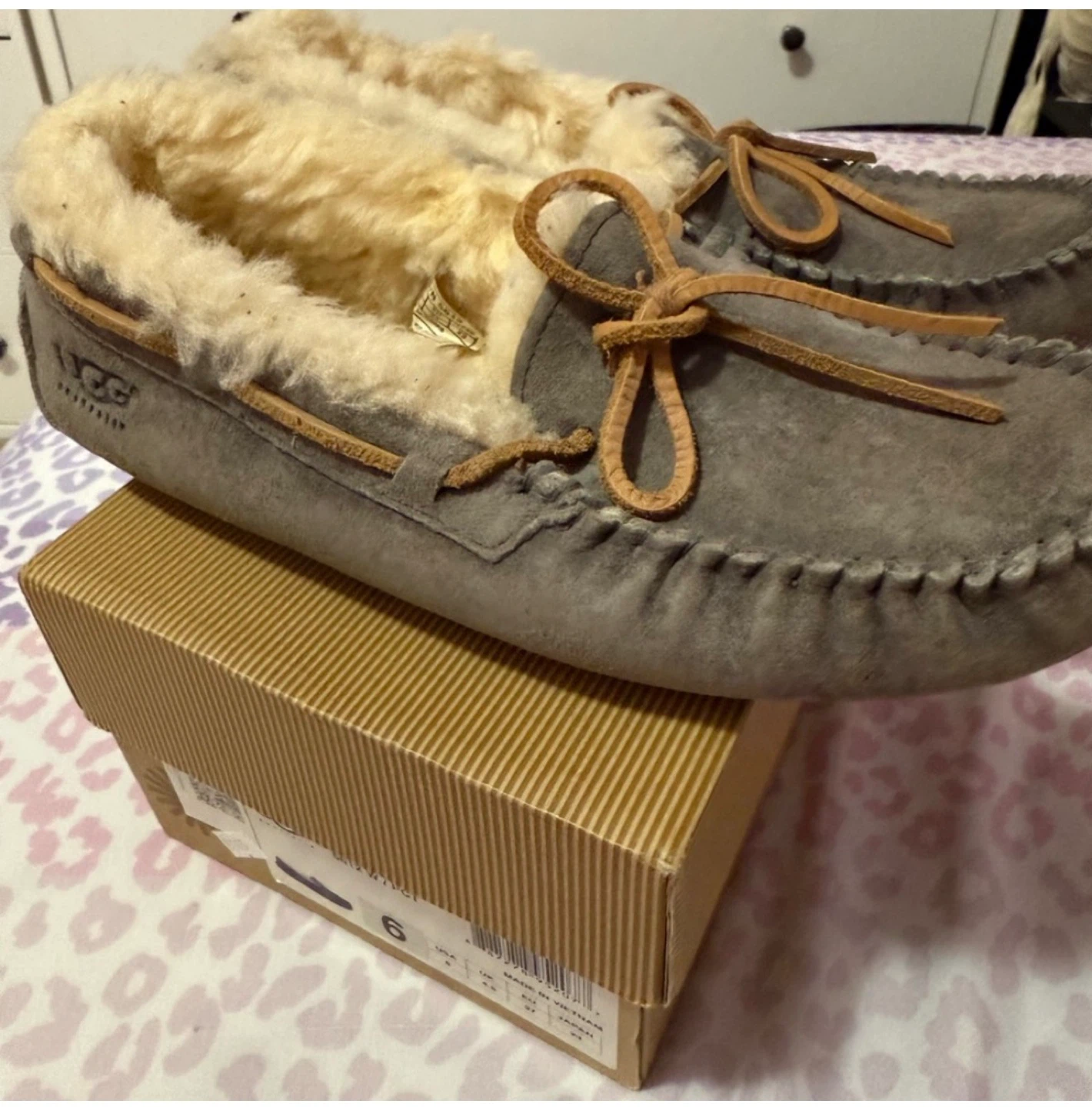 Selling a pair of UGG Dakota moccasin slippers in size 6. They're in good condition and come with the original box. These cozy slippers are perfect for keeping your feet warm and comfortable!