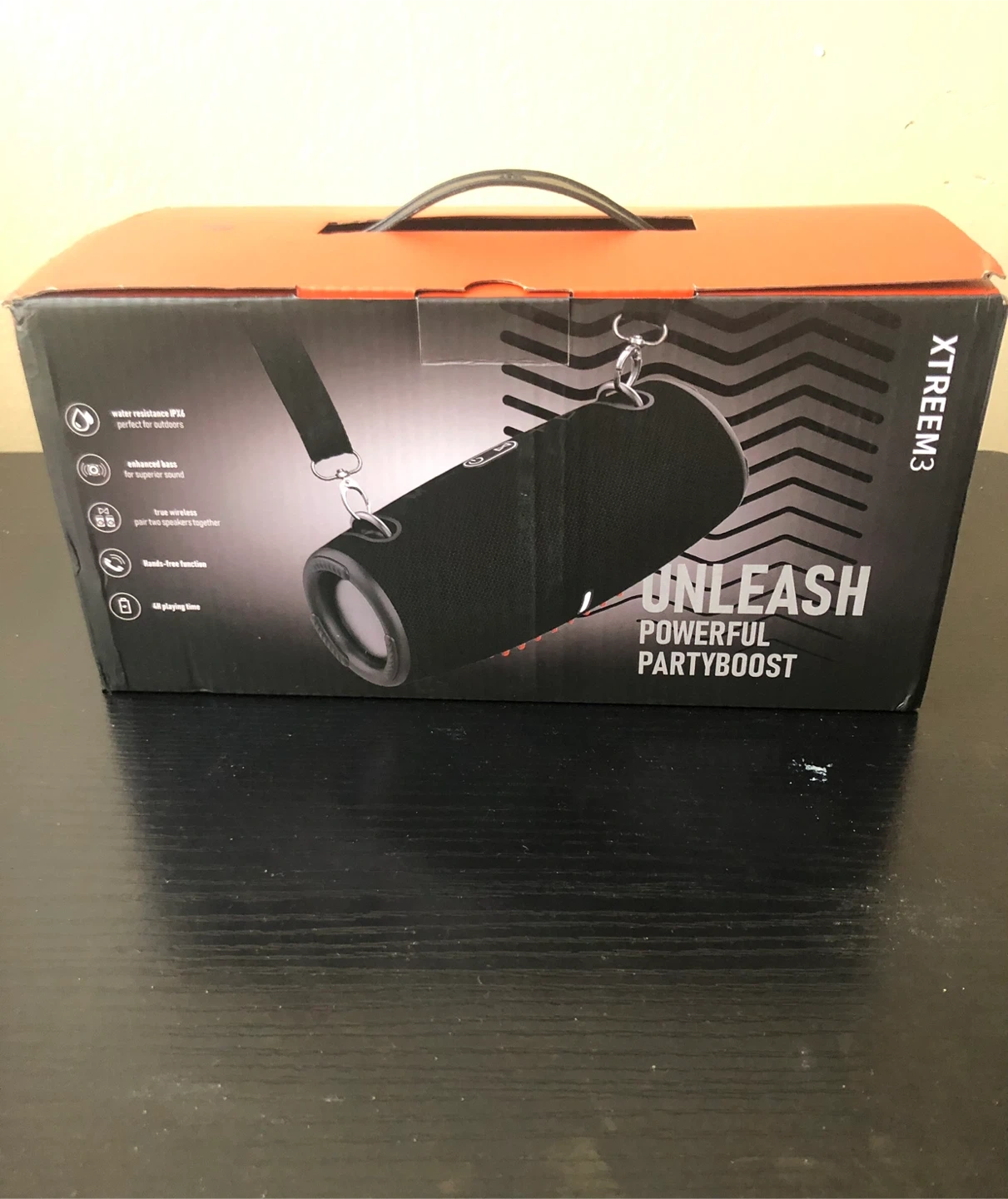 This is the XTREEM3 portable Bluetooth speaker. It features water resistance IPX6, perfect for outdoors. It offers enhanced bass for superior sound and true wireless pairing for two speakers together. It also has a hands-free function and up to 48 hours of playing time!