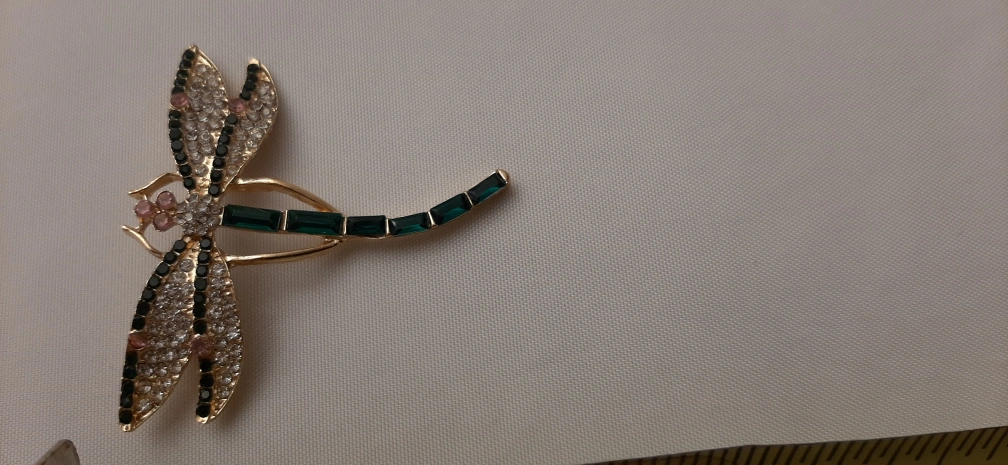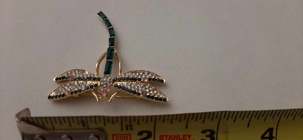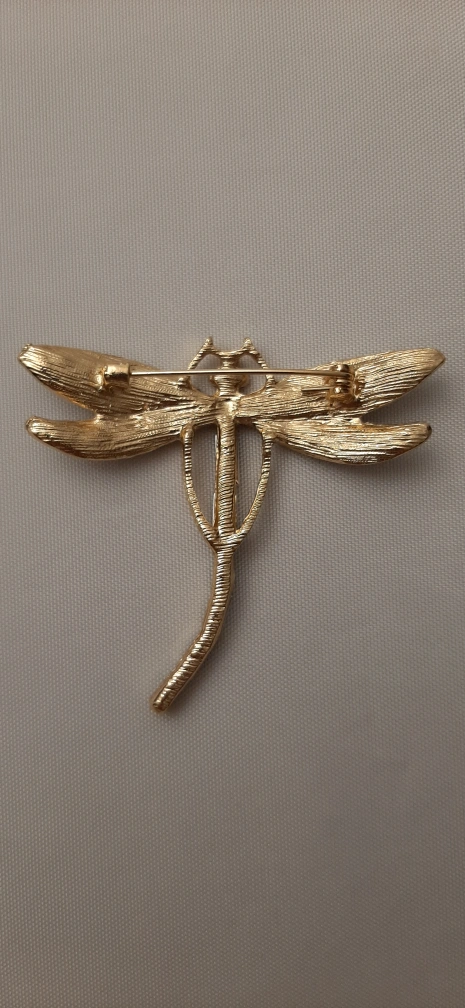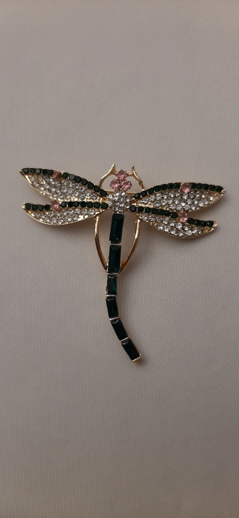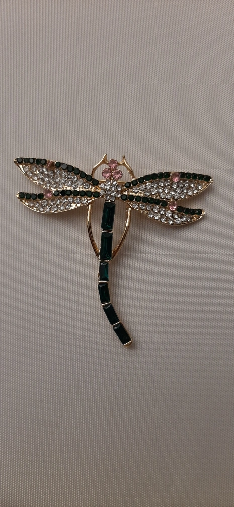 This is a beautiful dragonfly brooch. It has gold-tone metal with clear and emerald green rhinestones and small pink accents. It is in great condition!