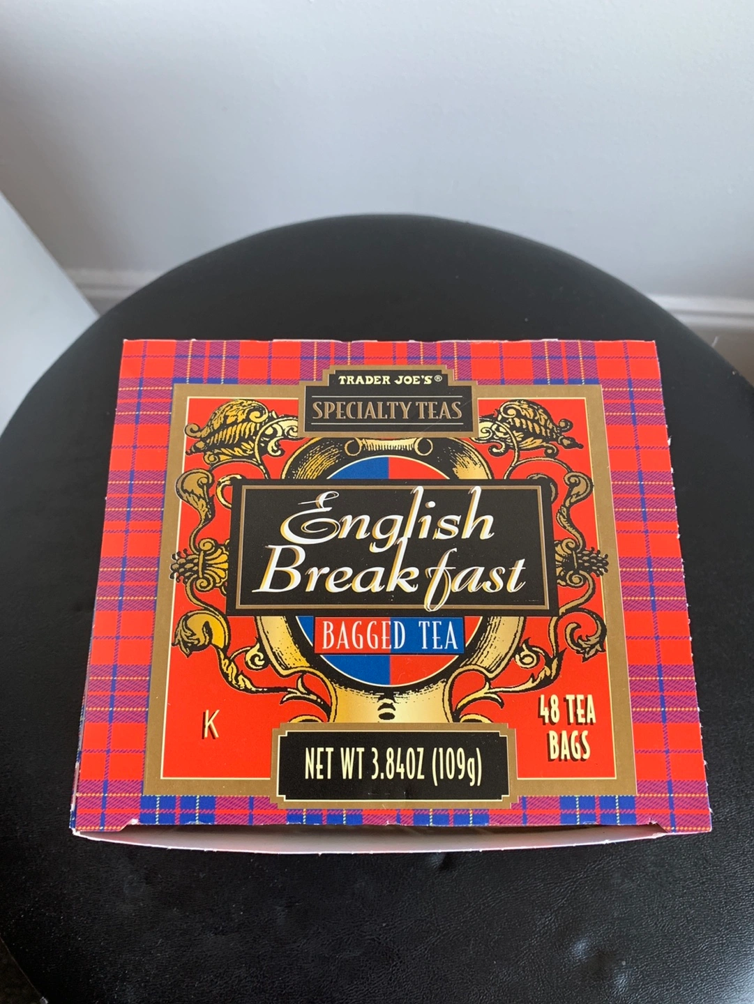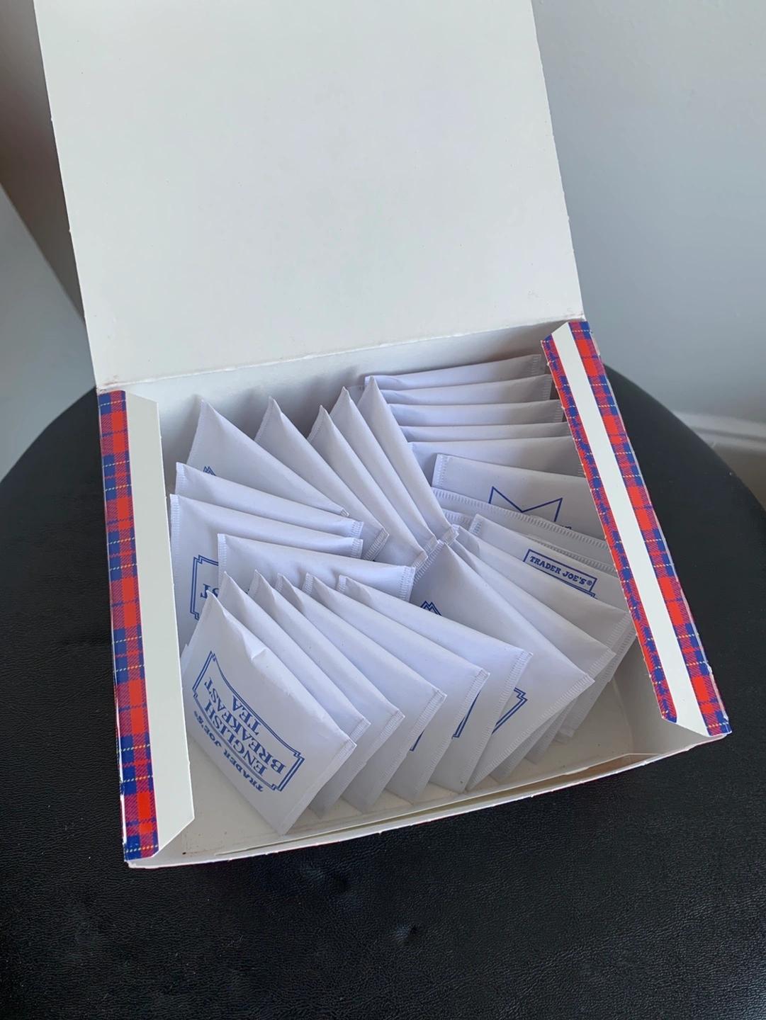 individually wrapped English Breakfast tea bags for someone who enjoys strong black tea. We started to drink green tea and don’t need this anymore ☕️ The box is open but there’s still a lot of tea bags!