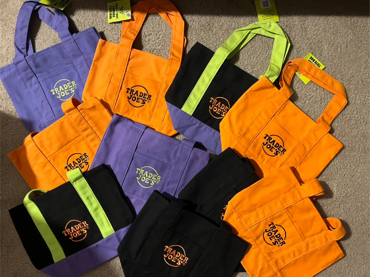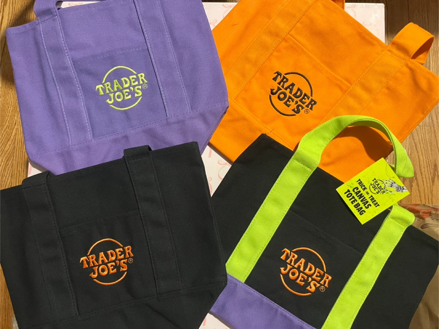 600I have a few Trader Joe's Trick or Treat canvas tote bags for sale! They come in black, orange, and purple. These are perfect for Halloween or just carrying your groceries. The bags are made of durable canvas material and feature the Trader Joe's logo. $8/bag