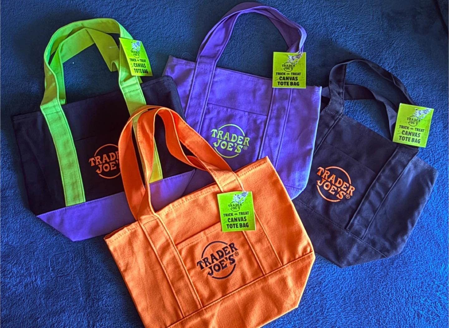 I have some Trader Joe's Trick or Treat canvas tote bags for sale! They come in a variety of colors: orange, purple, and black with neon green accents. These are great for Halloween or everyday use!