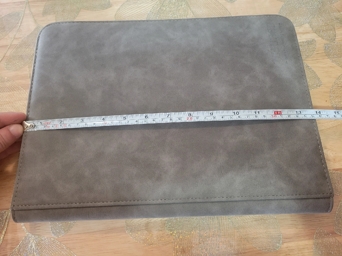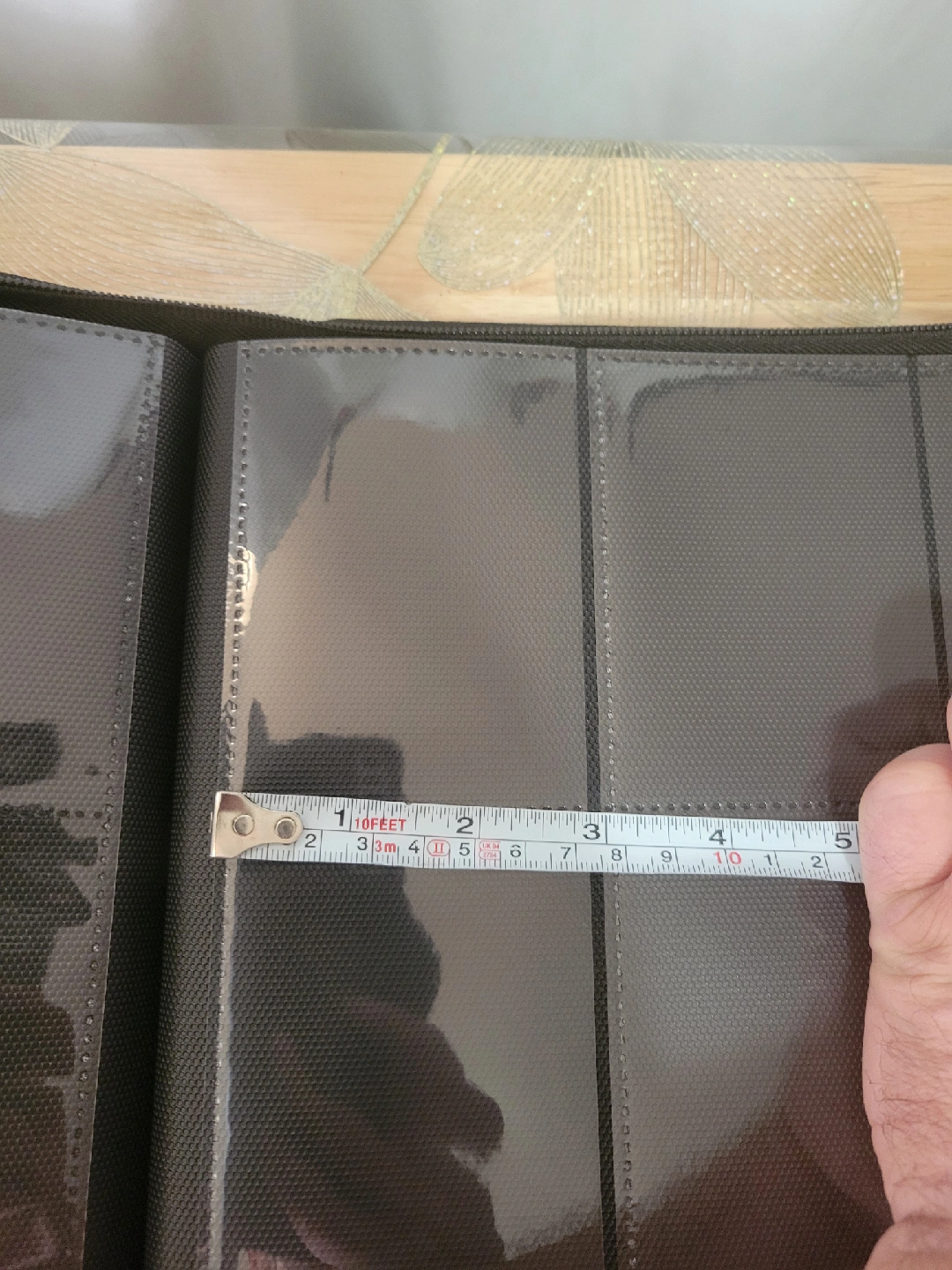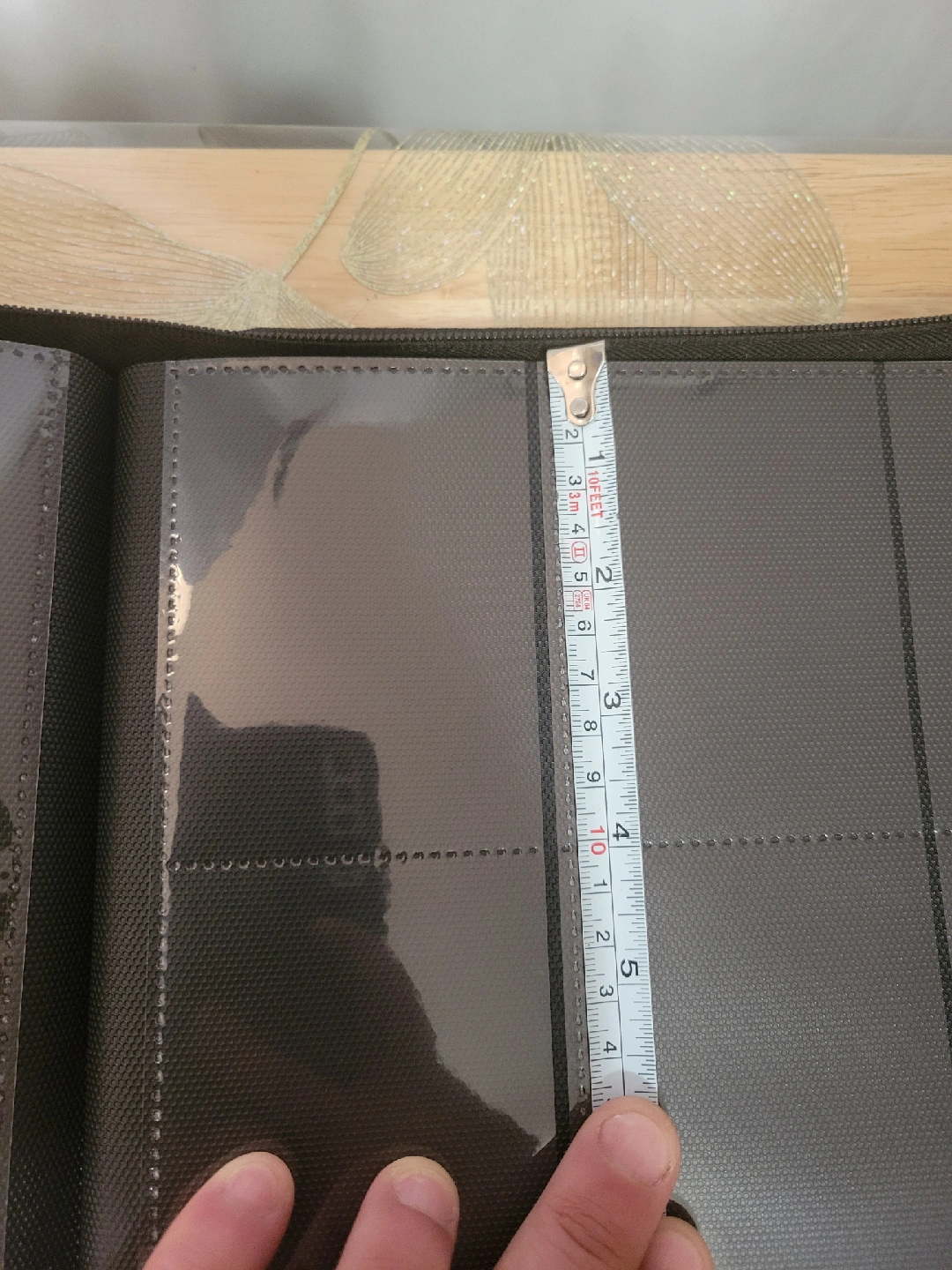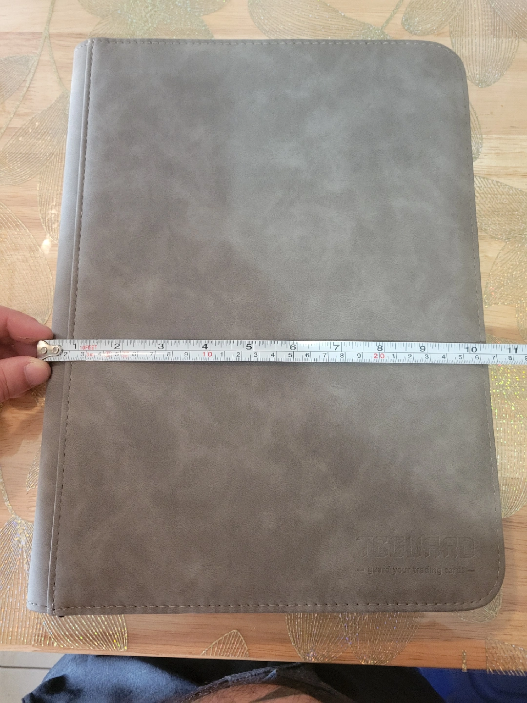 Selling a trading card binder album in gray! It has a zippered closure and measures approximately 14 inches by 11 inches when closed. Each card slot is about 4 inches by 3 inches 30 sheets with 18 pockets each. Total capacity: 540 cards.