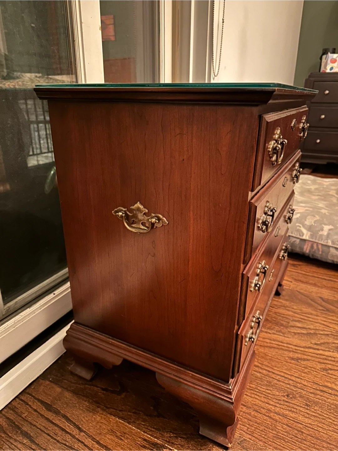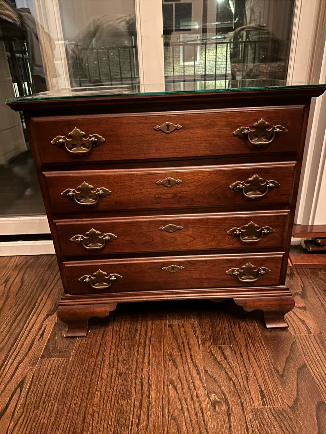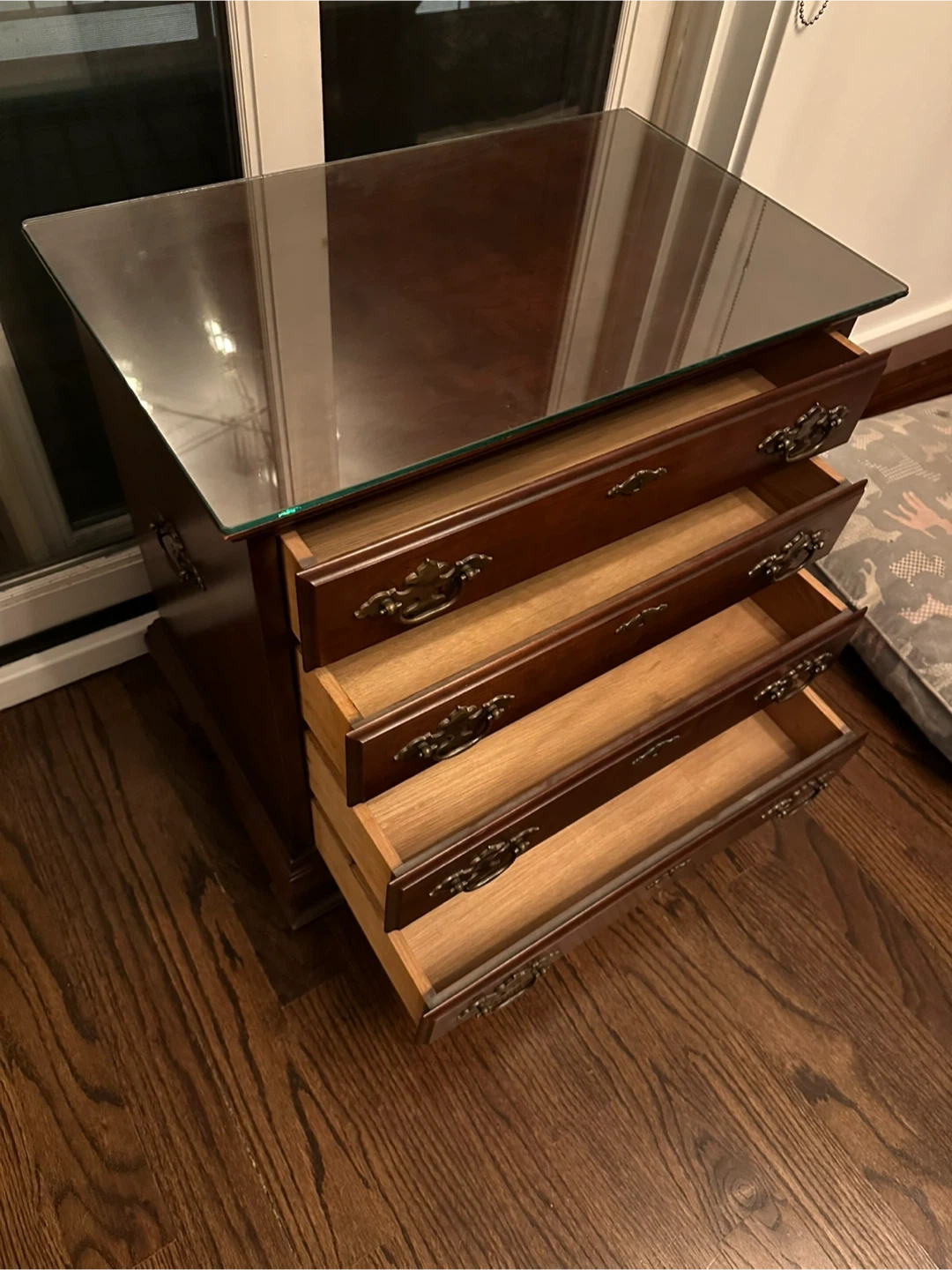 Beautiful solid wood nightstand with 4 drawers in a traditional colonial style. Classic and high quality, in excellent condition. The top has been protected with a custom glass surface, so it has no marks or stains. This was my grandmother’s and I’m only parting with it because there’s only one and we wanted a set for our bedroom. The four drawers are great storage next to the bed. 15” deep x 24” wide x 24” high Ukrainian Village near Augusta and Western. Pick up only. Cash (exact change), Venmo, or Zelle.