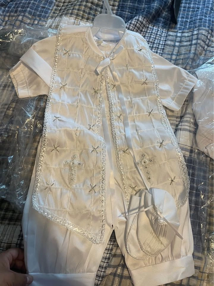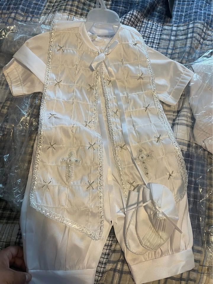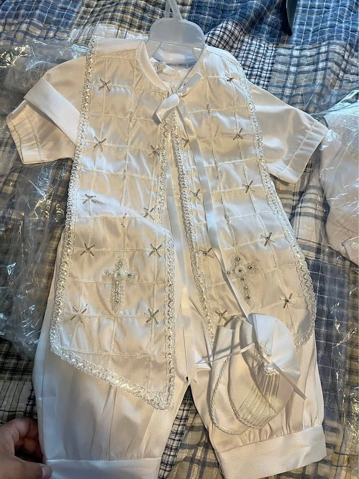 Traje de bautizo talla 2 trae una sabana, totalmente nuevo, si necesitas un video más detallado con gusto te lo mando