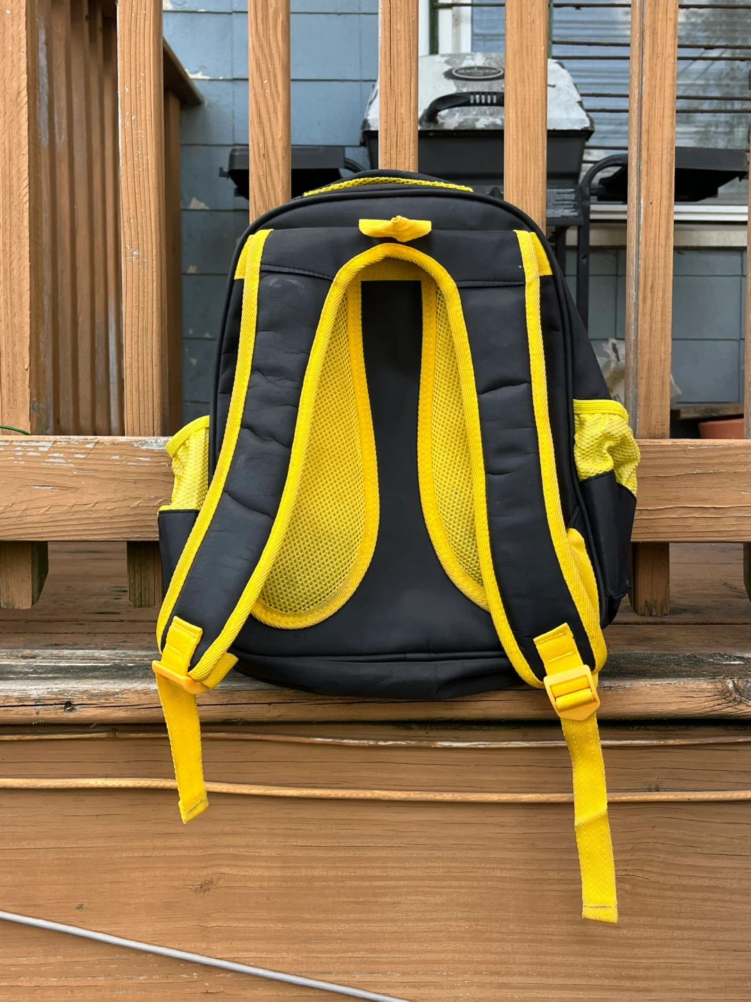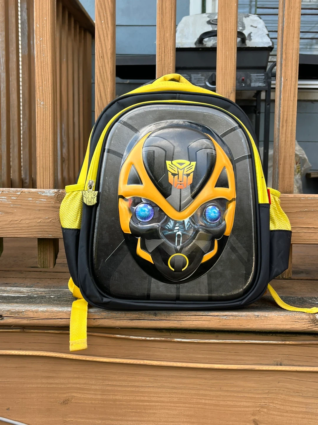 Here's a cute Transformers Bumblebee backpack for kids! It features a cool Bumblebee design with yellow accents on a black background. Perfect for school or travel