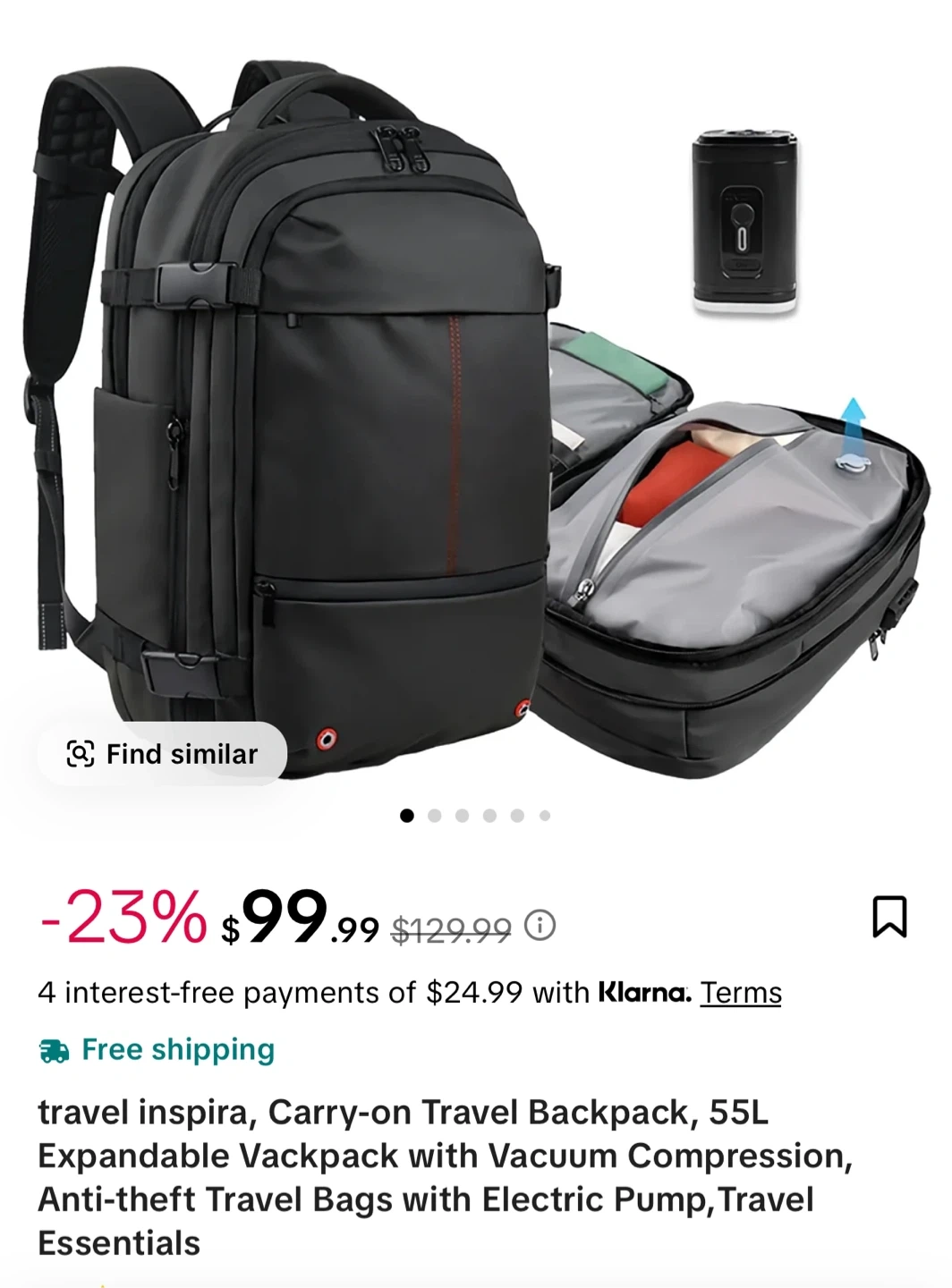This is a Travel Inspira carry-on travel backpack with vacuum compression. It's a 55L expandable backpack that can be compressed to 36L with the vacuum. It comes with anti-theft travel bags and an electric pump. The dimensions are 12.5x7.9x19 inches. Originally bought for $99.99