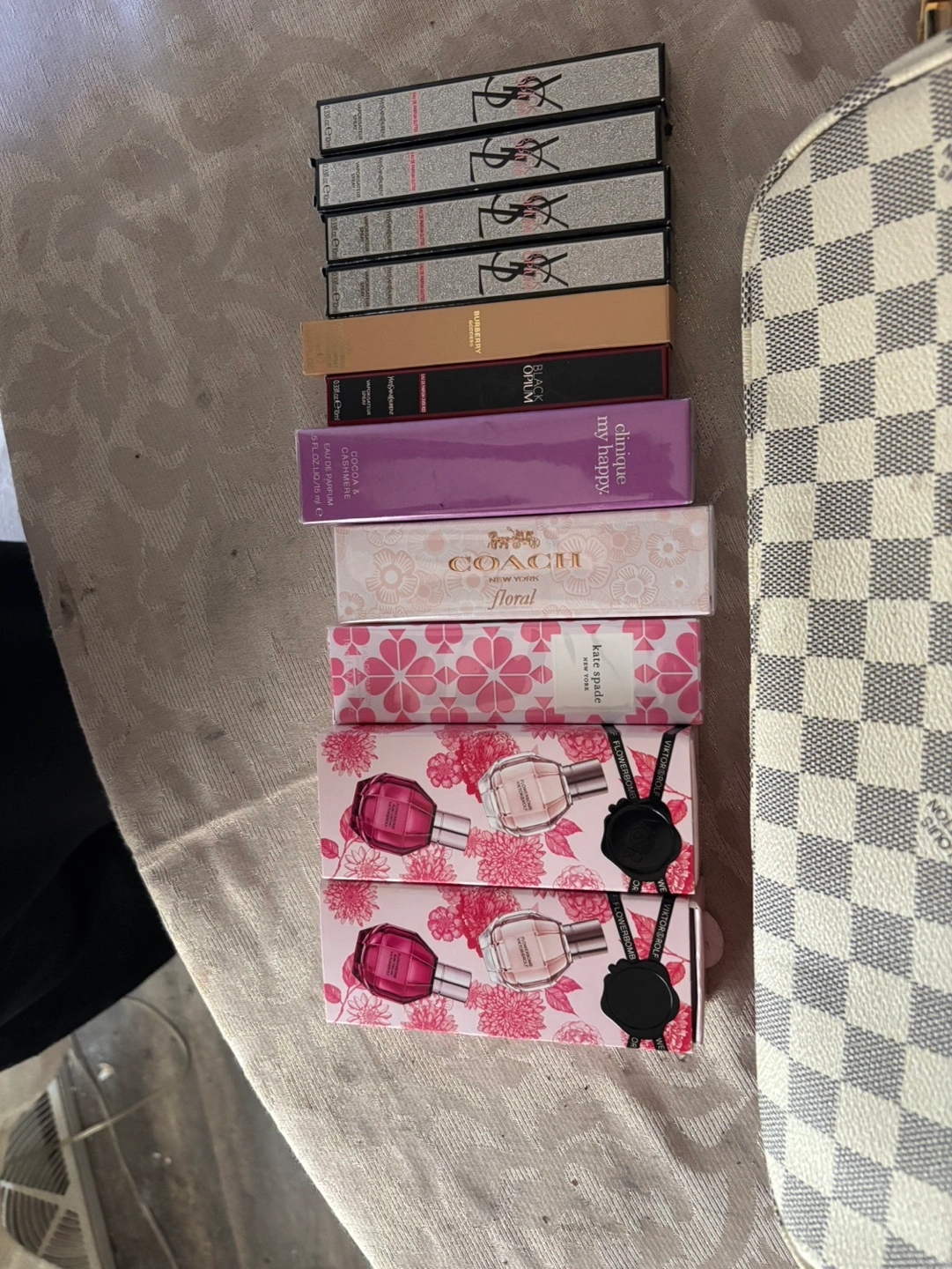 Assortment of miniature perfumes and beauty products. Includes Yves Saint Laurent, Clinique, Coach, and Kate Spade. Great gift or for personal use.
