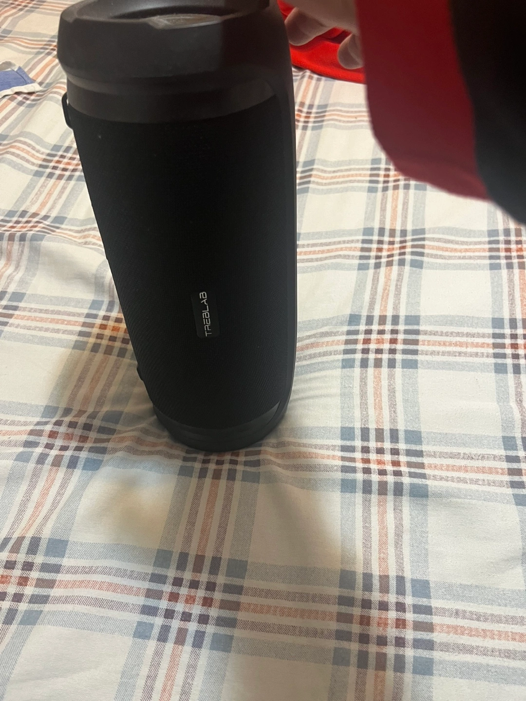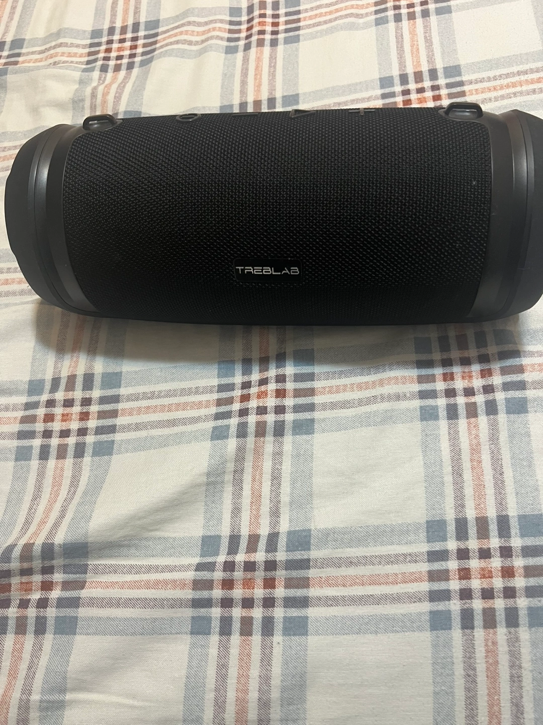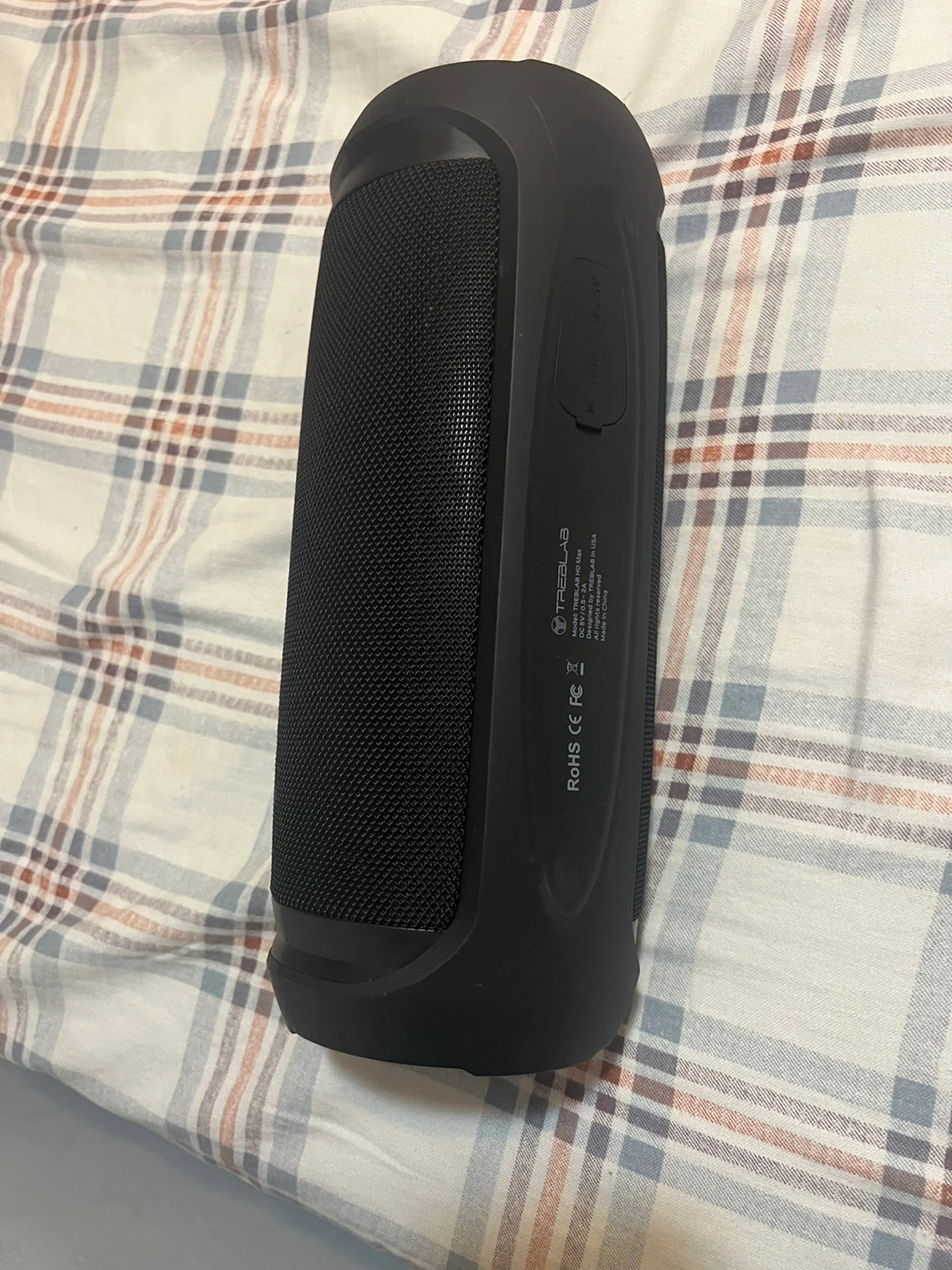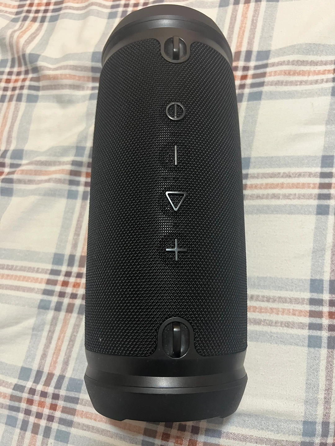 Black portable Bluetooth speaker. Great sound. Buttons for volume, play/pause, and other functions. Long battery life. Perfect for travel or home use.