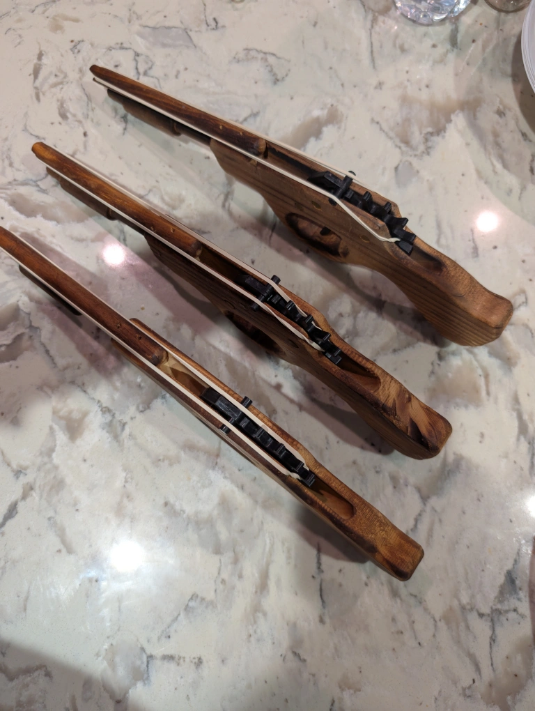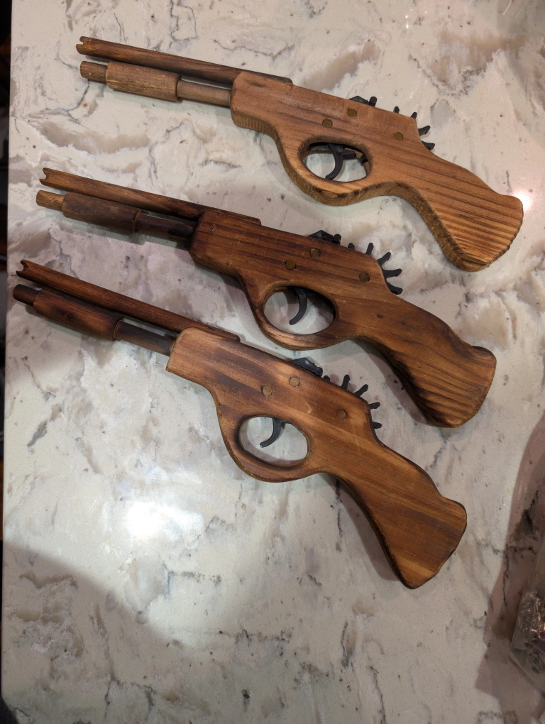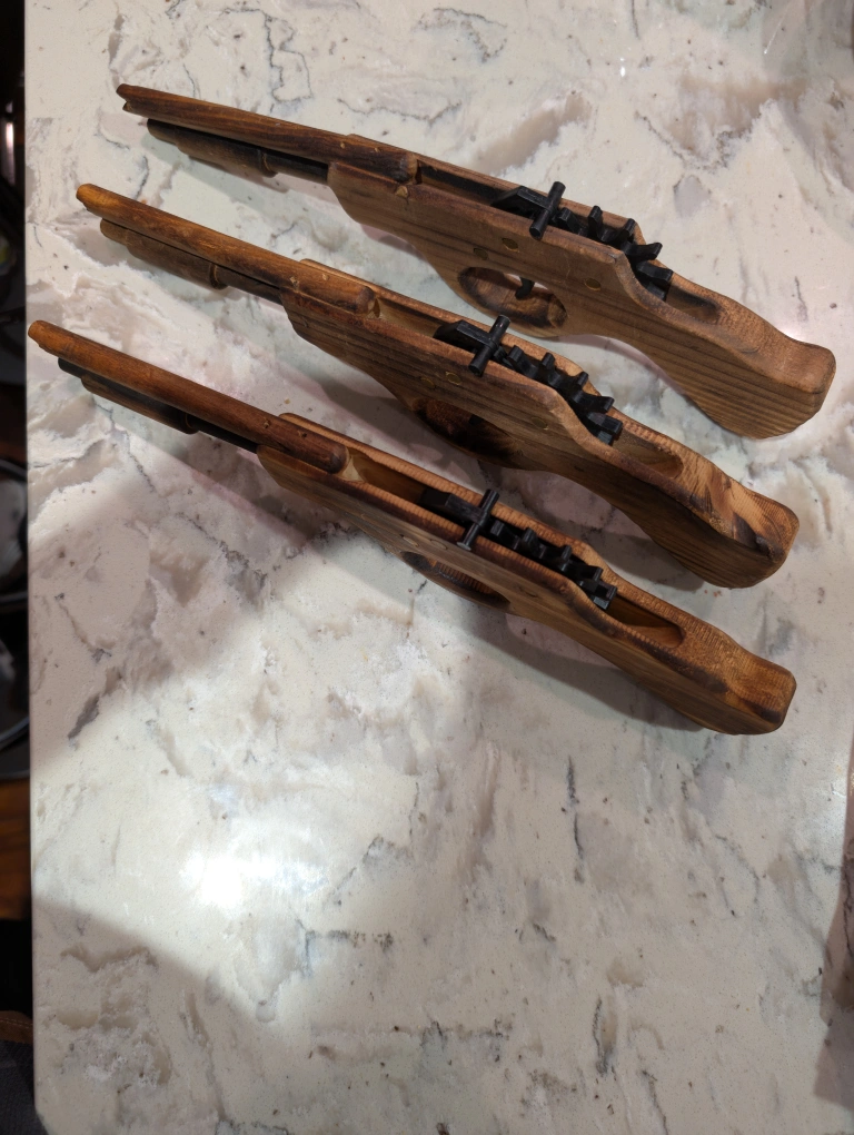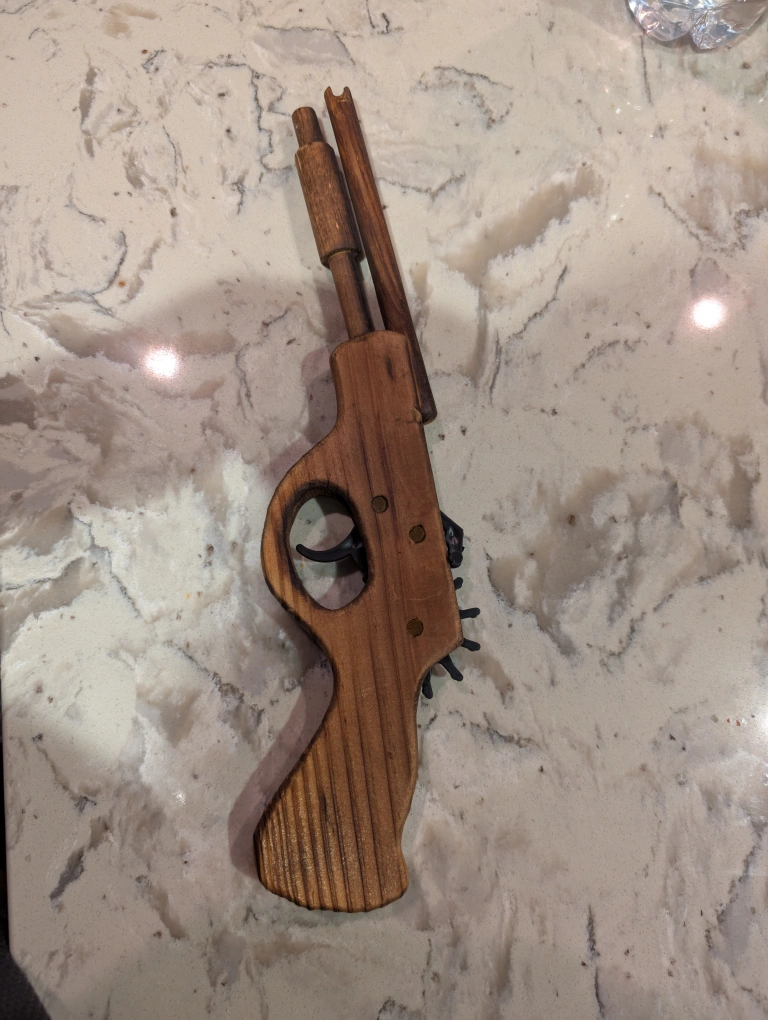 Selling a handmade wooden toy gun that shoots rubber bands. It's a fun and safe toy for kids and adults alike. The gun is made of wood and has a classic design. Band pistol launcher target practice shooting toy gun, hand made quality wood .