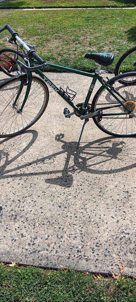 Selling a green Trek 730 road bike. It has a water bottle holder and a kickstand. Great for getting around town or enjoying a ride!