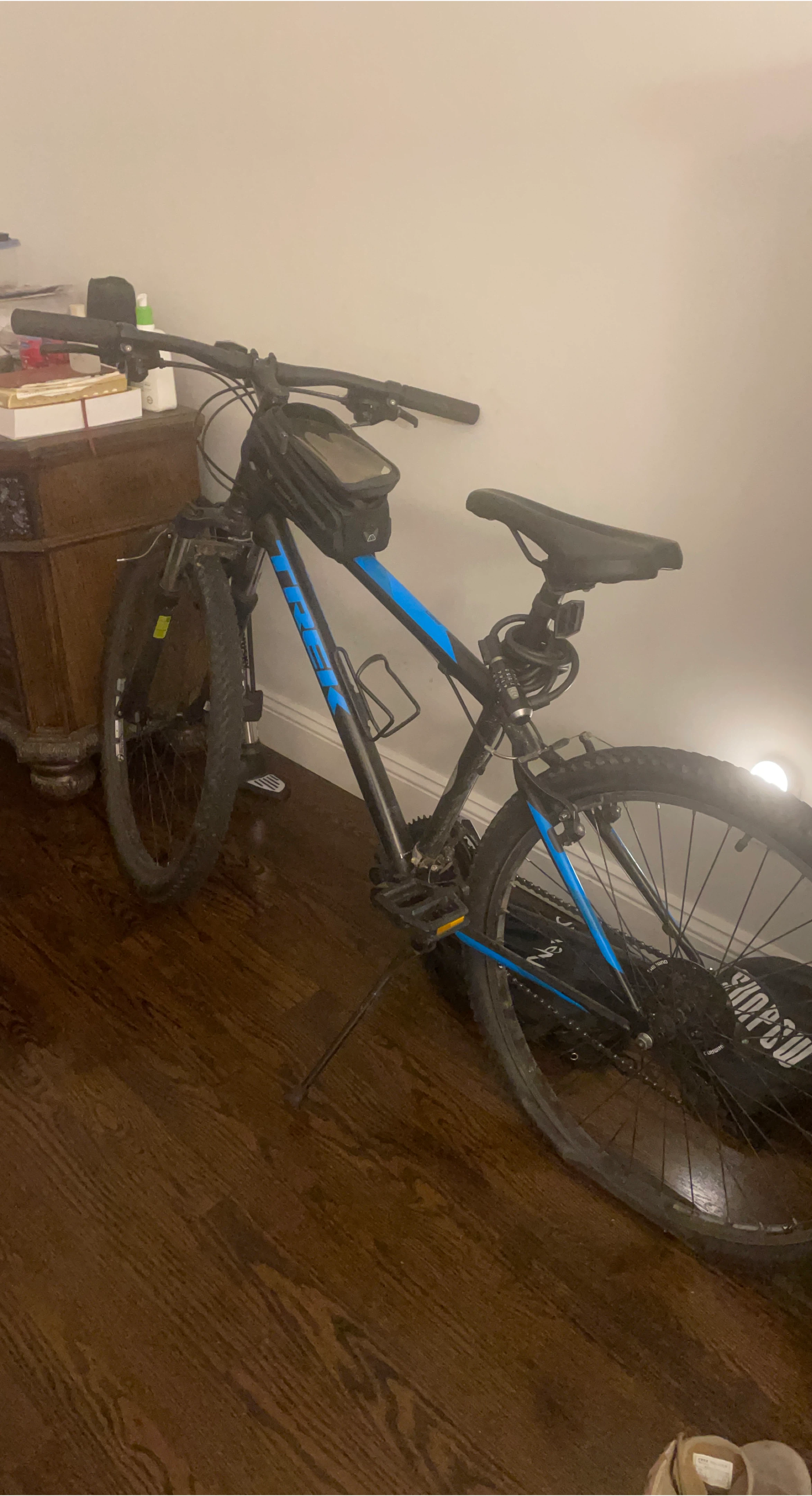 Selling a Trek mountain bike! It features a black frame with blue accents. Perfect for hitting the trails or getting around town