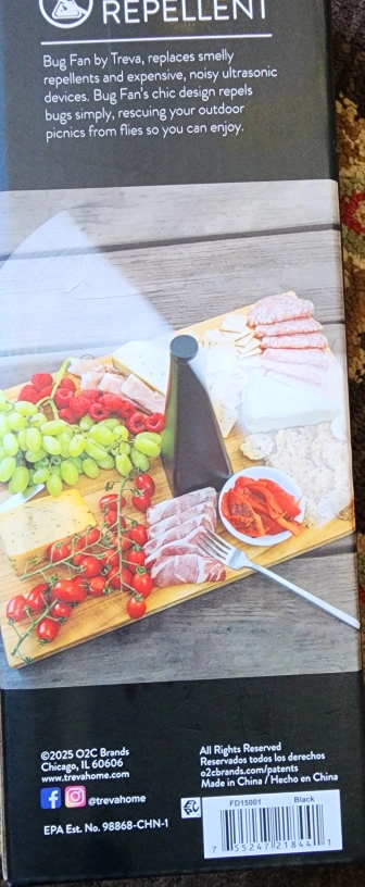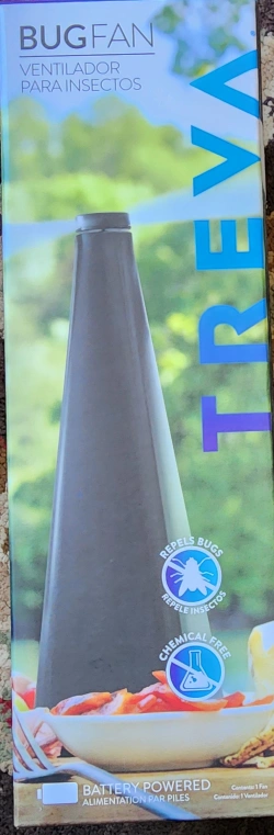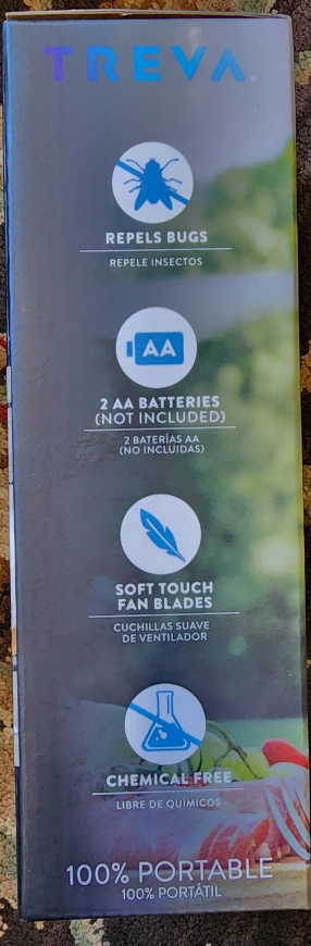 I'm selling a brand new TREVA Bug Fan, still in its original packaging! This portable fan is designed to repel bugs, making it perfect for outdoor picnics and gatherings. It features soft-touch fan blades and is chemical-free. Please note that it requires 2 AA batteries (not included).