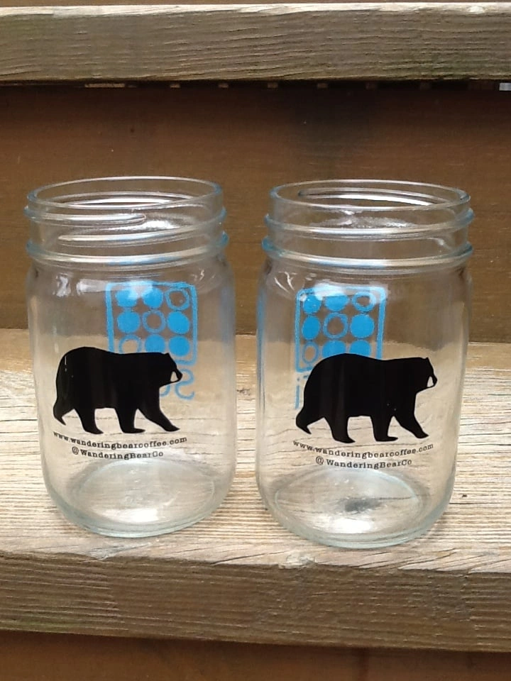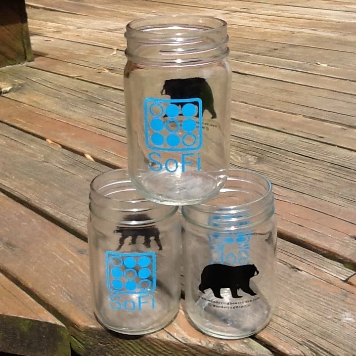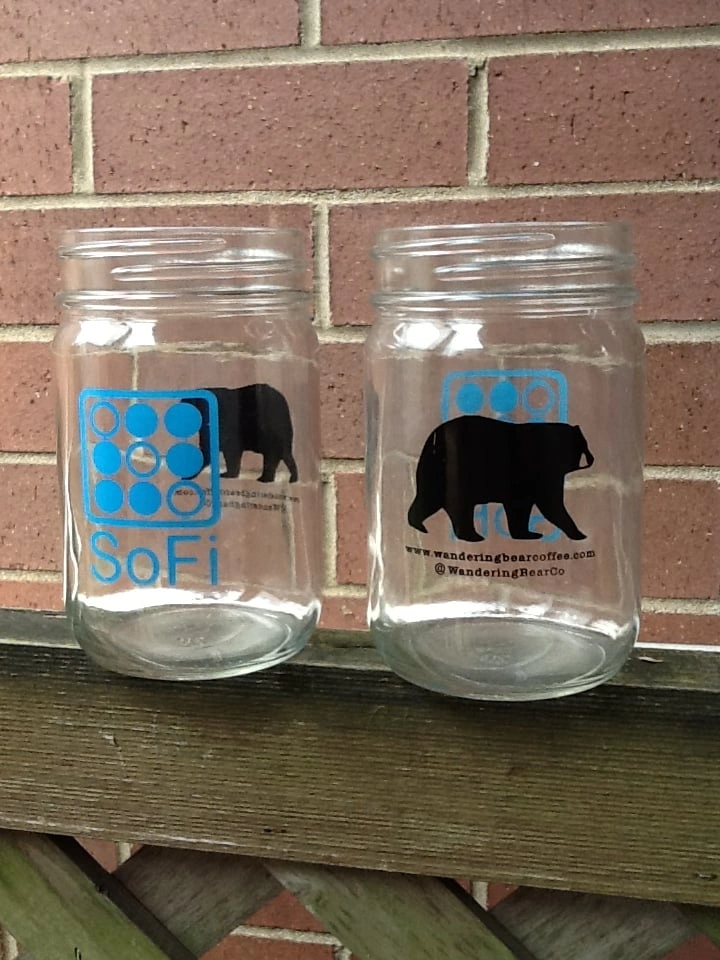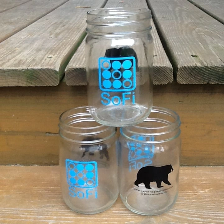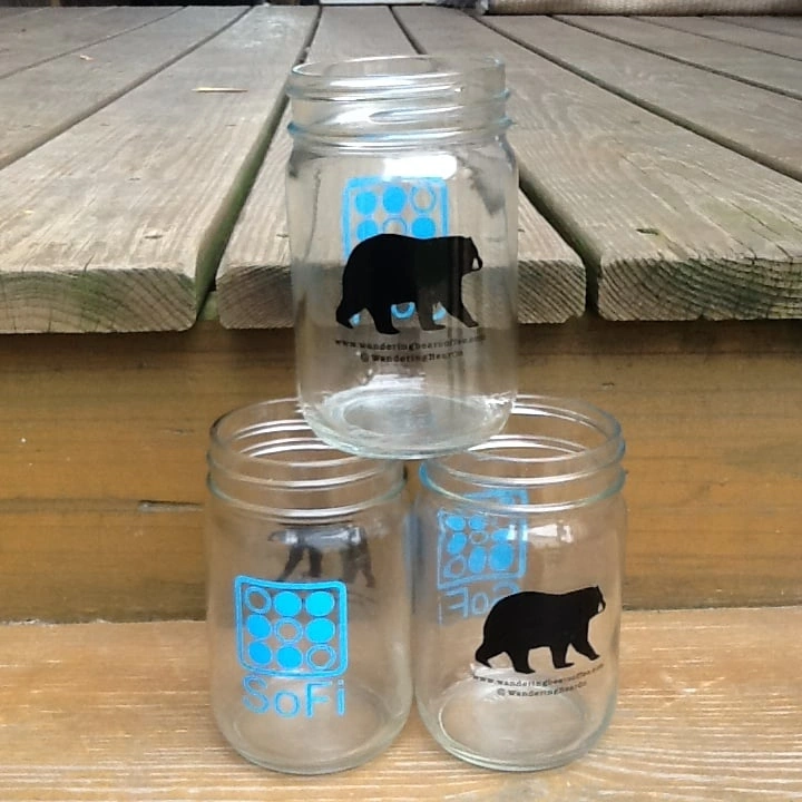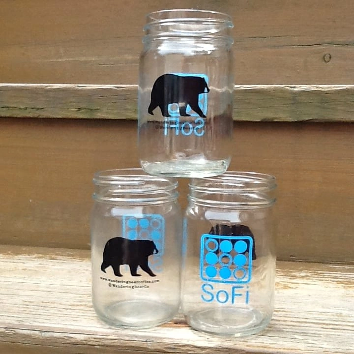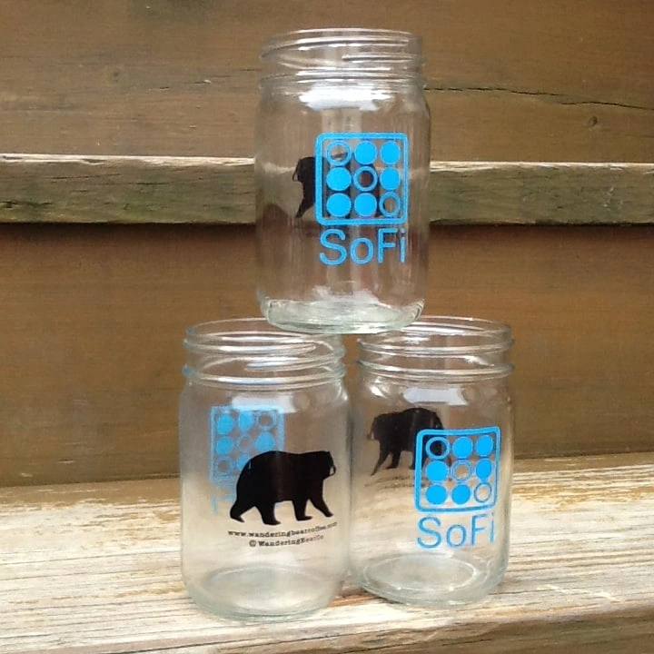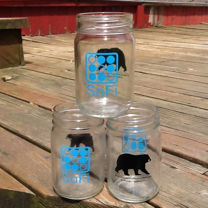 Trio Of SoFi Wandering Bear Coffee Jars - 4.75" Tall - Like New Excellent condition with no chips or cracks. These are typically used for cold brew coffee but would also be perfect for Bloody Marys. SoFi logo on one side and Wandering Bear Coffee on the other. I took the pictures outdoors for best lighting and color representation. From a smoke and pet free home. Check out in person before purchasing. Thanks for looking.