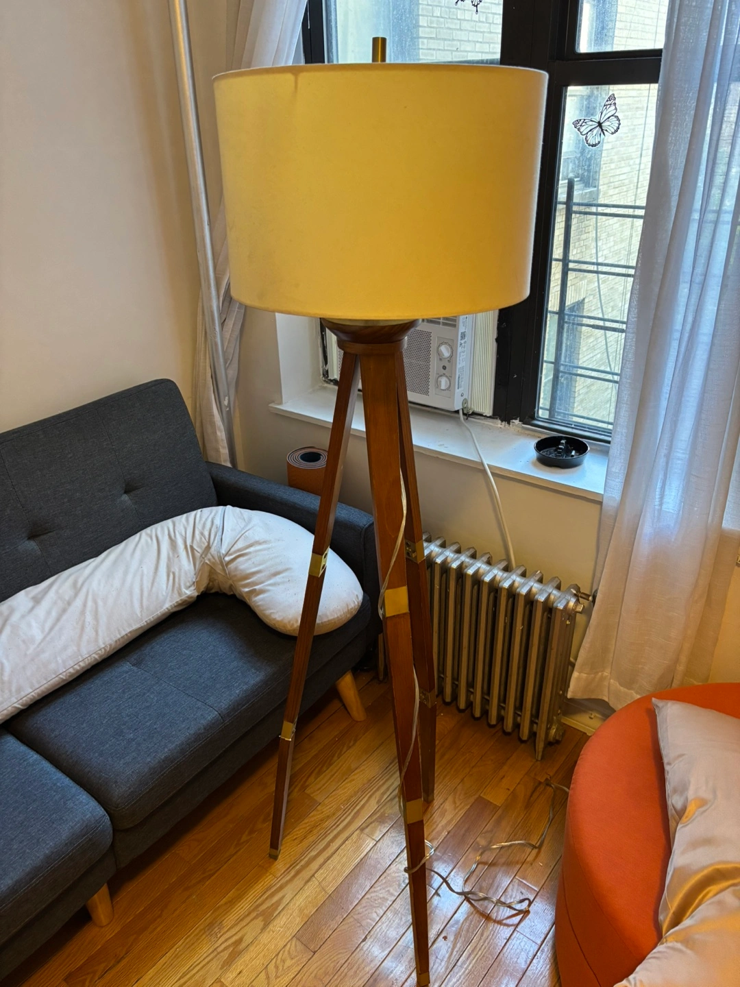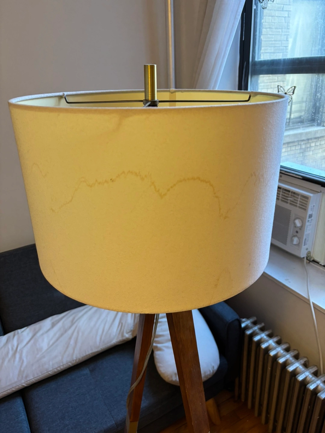 Selling a tripod floor lamp! It has a wooden base and a cream-colored shade. There are some stains on the shade, as pictured. Has wobbly legs but still fully functional.