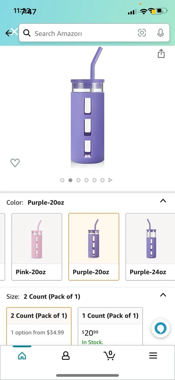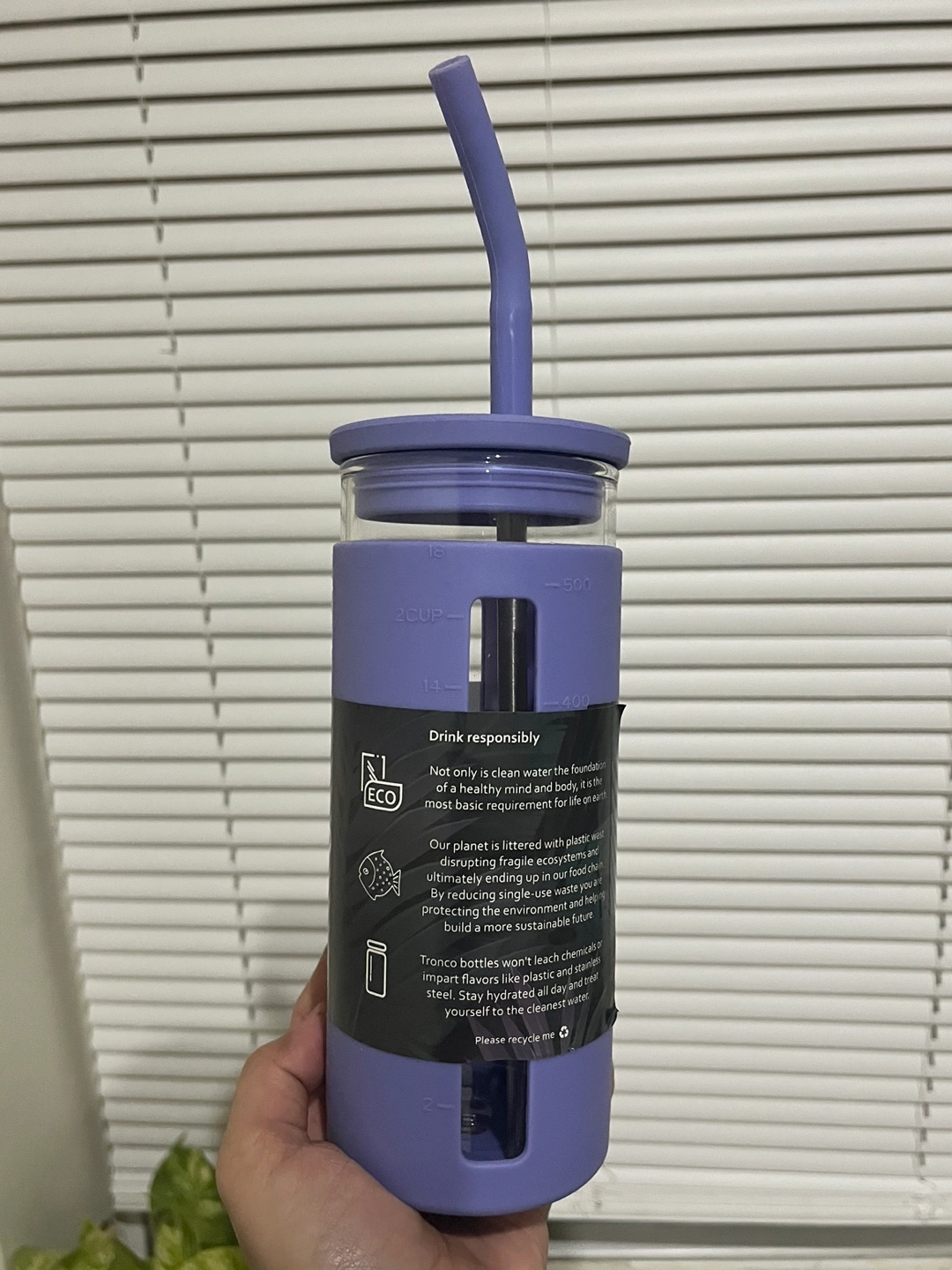 73Reusable water bottle. Purple silicone sleeve. Glass interior. Includes a straw. 20oz capacity.