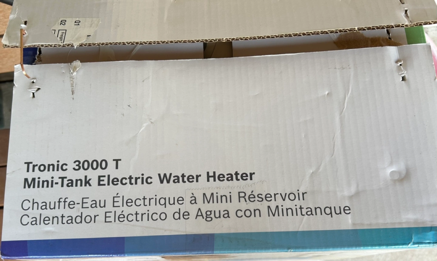 New in box, 4-gallon mini-tank electric water heater. Easy installation. Lightweight and compact. 6-year warranty.