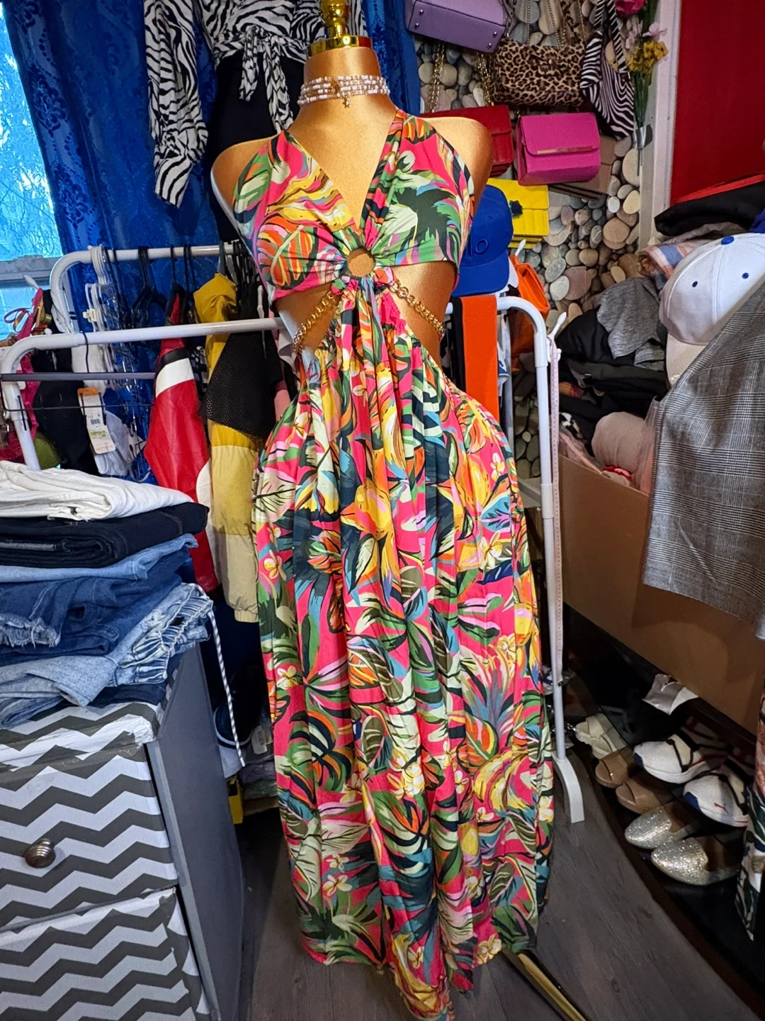 Beautiful and vibrant tropical print maxi dress! It features a halter top and a unique cutout design with gold chain detailing. Perfect for summer or a vacation getaway
