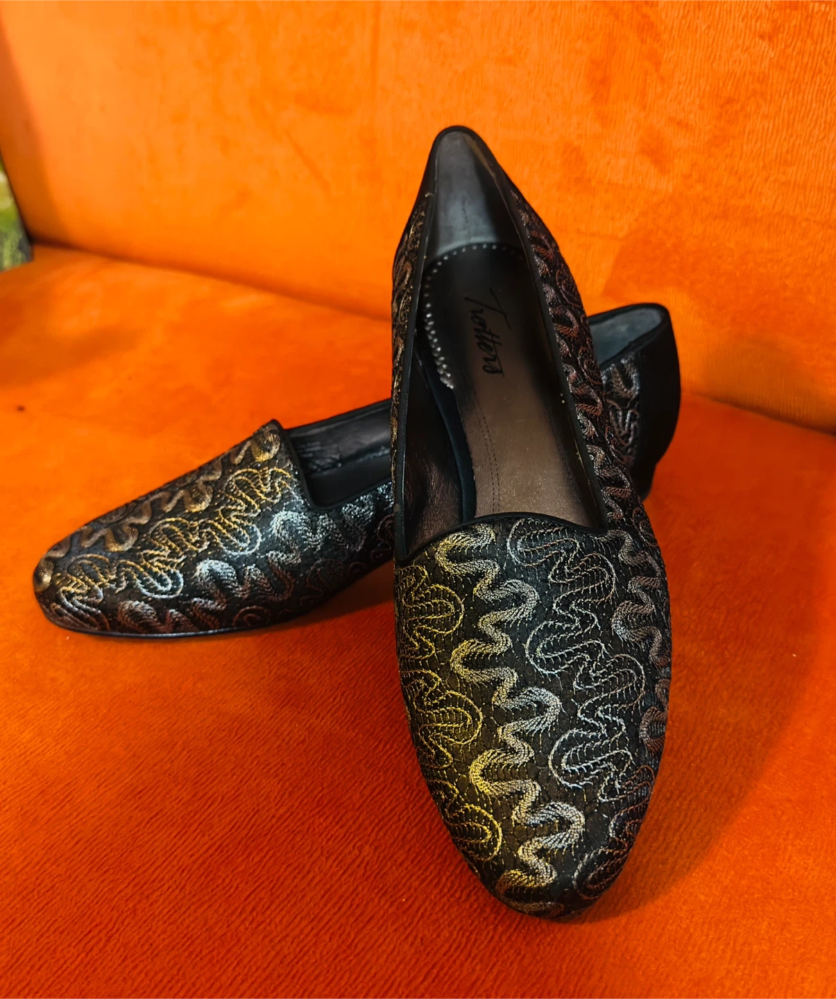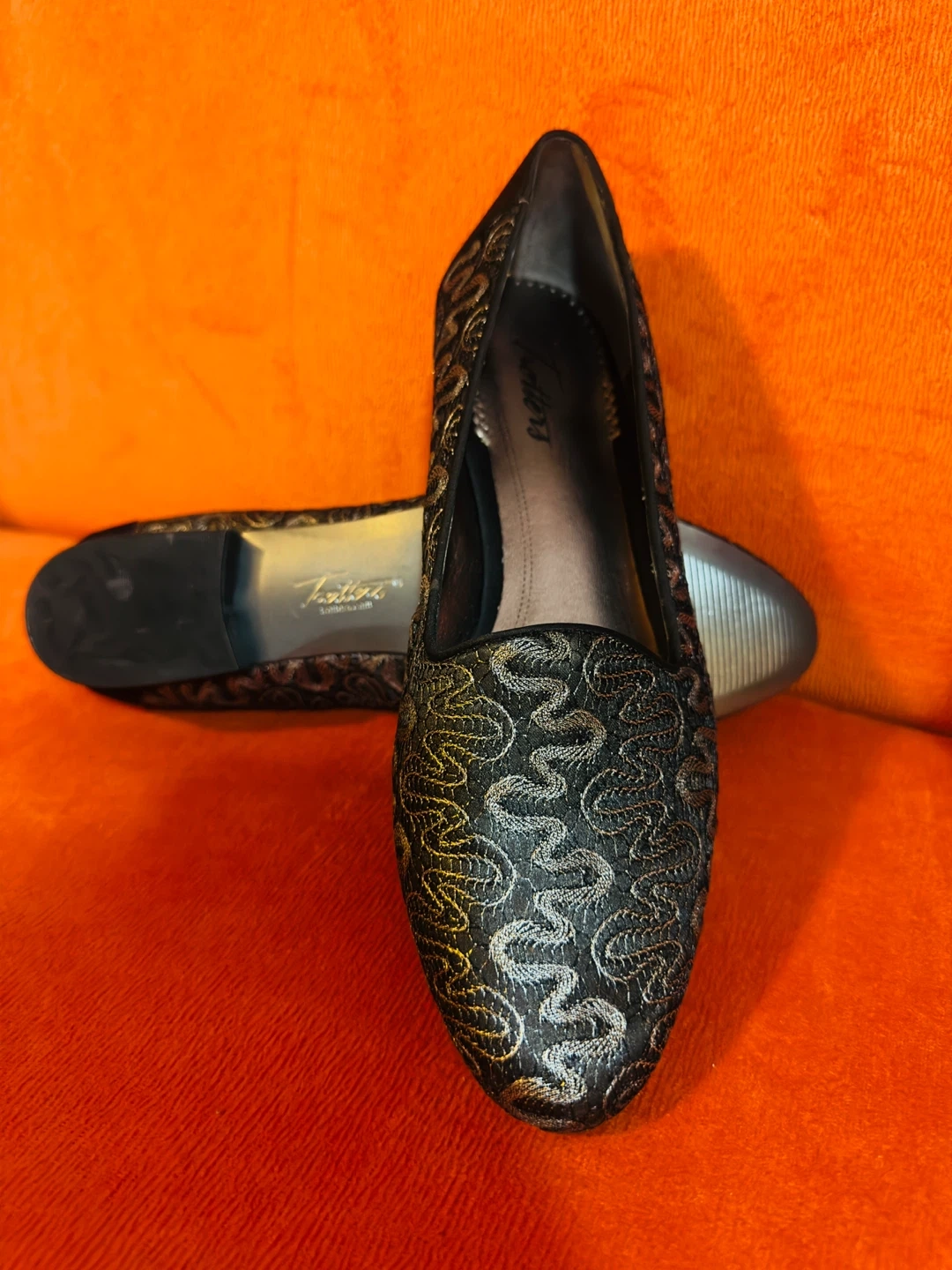 20These Trotters loafers are a stylish addition to any wardrobe! They feature a beautiful black and gold pattern that catches the eye. These shoes are in great condition never been use and ready for a new home!